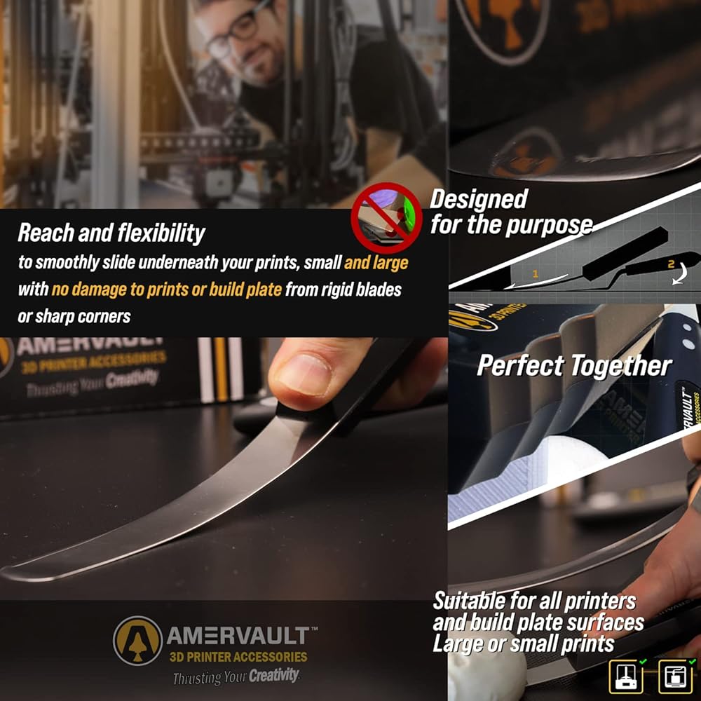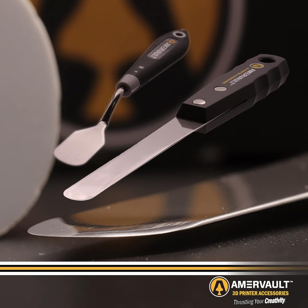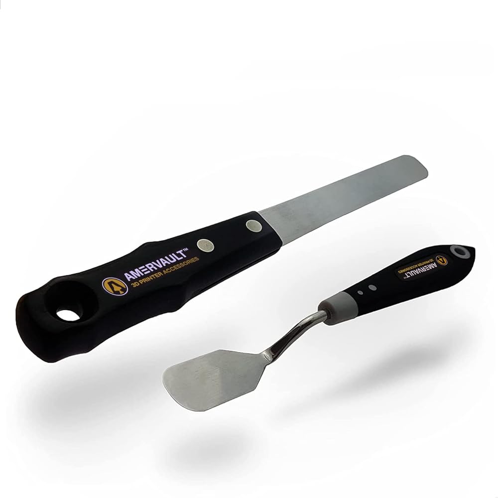 Long knife with a beveled front edge; Slides very gently underneath prints with ease to protect the build bed surface yet provides good reach and allows prying