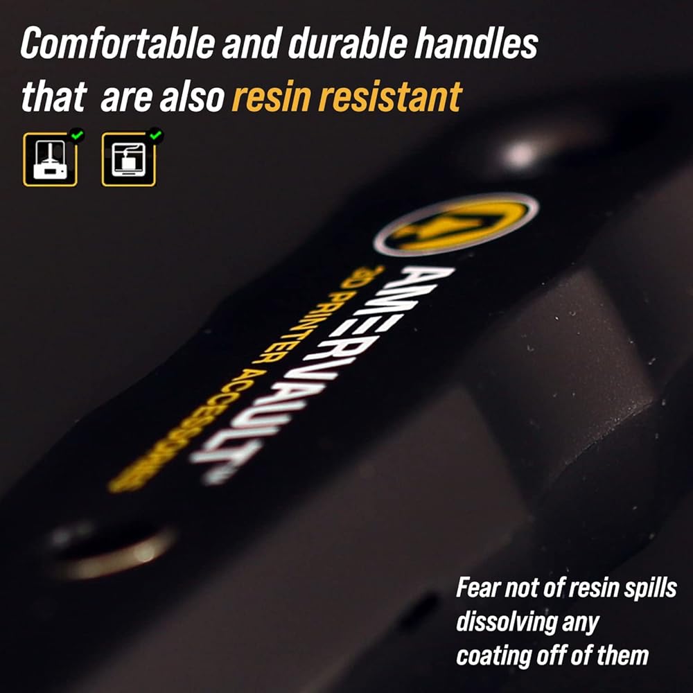 Are you looking for a 3D print removal toolset with Solid, riveted handles that won't come loose and start spinning, twisting or turning after use? Hardened stainless steel blades that are optimally flexible without being too flimsy and/or getting scratched and gouged by the print bed surface due to their softness? A knife tool with a sharpened front edge (flat bottom) for getting under even the most-adhered prints with ease? Ability to reach into the back under larger parts, sweep across and lever them off , as well as handle smaller, more delicate objects? Durable comfort handles with grips designed for a firm hold that feel good in the hand and look stylish too? Safe, rounded blades easier on your fingers, prints and printer surface? REPTOR 3D Print Removal Tools have been designed with all these aspects in mind.These tools are not your average repurposed painters putty knives with cramp rings that come loose or fall apart before long when used to remove 3D prints! This REPTOR toolset is designed to get even the most stubborn prints off the bed without distorting them or damaging the print bed surface. Both handles have solid rivets in them that will hold the blades in place and will not permit the blades to turn or yield. The knife with its 4.92" blade and beveled front edge can be used to sweep across and reach into the back under larger parts and provide leverage to pop even a stubborn piece up while the spatula is thin and flexible enough to get under even the most delicate of objects without distorting them. They are the perfect duo - practical and durable, yet comfortable and stylish! Get yours now!