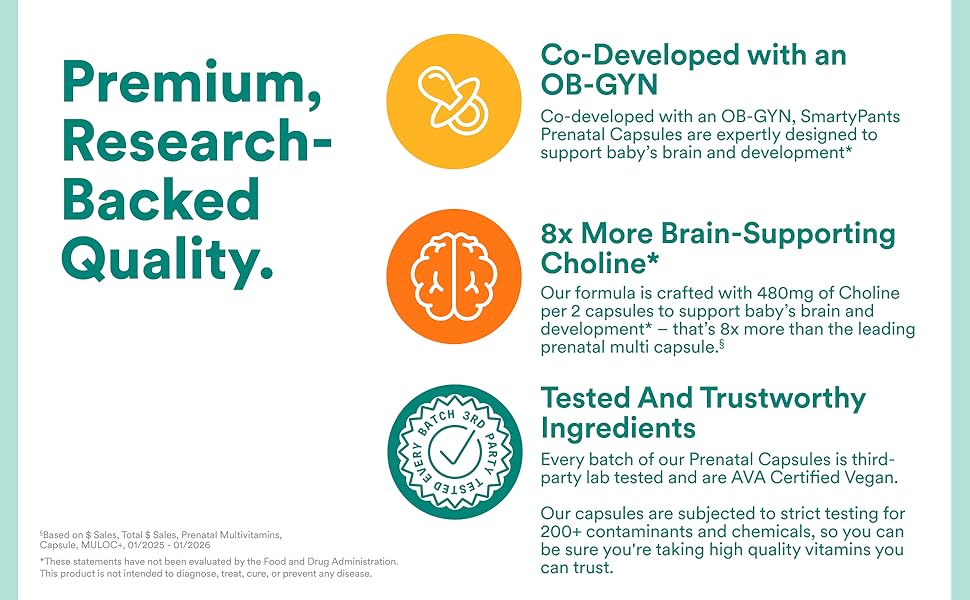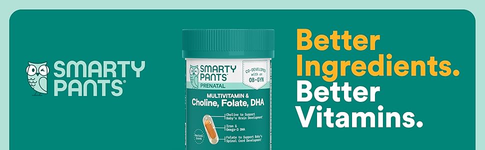 SmartyPants Prenatal Plus Multivitamin Capsules provide 8x more choline§ than the leading Prenatal Capsule to support baby's brain and development.* Co-developed with an OB-GYN, this expertly-crafted formula includes premium forms of nutrients and clinically tested Ferrochel® iron. All SmartyPants formulas are third-party lab tested for purity and potency, have earned the Clean Label Project® Purity Award, and are Certified Gluten-Free and Certified Free From™ the 9 Major US Allergens (milk, eggs, shellfish, soy, peanuts, wheat, fish, tree nuts, and sesame).