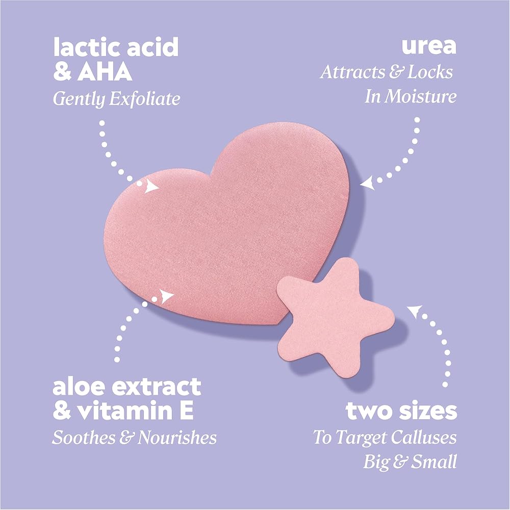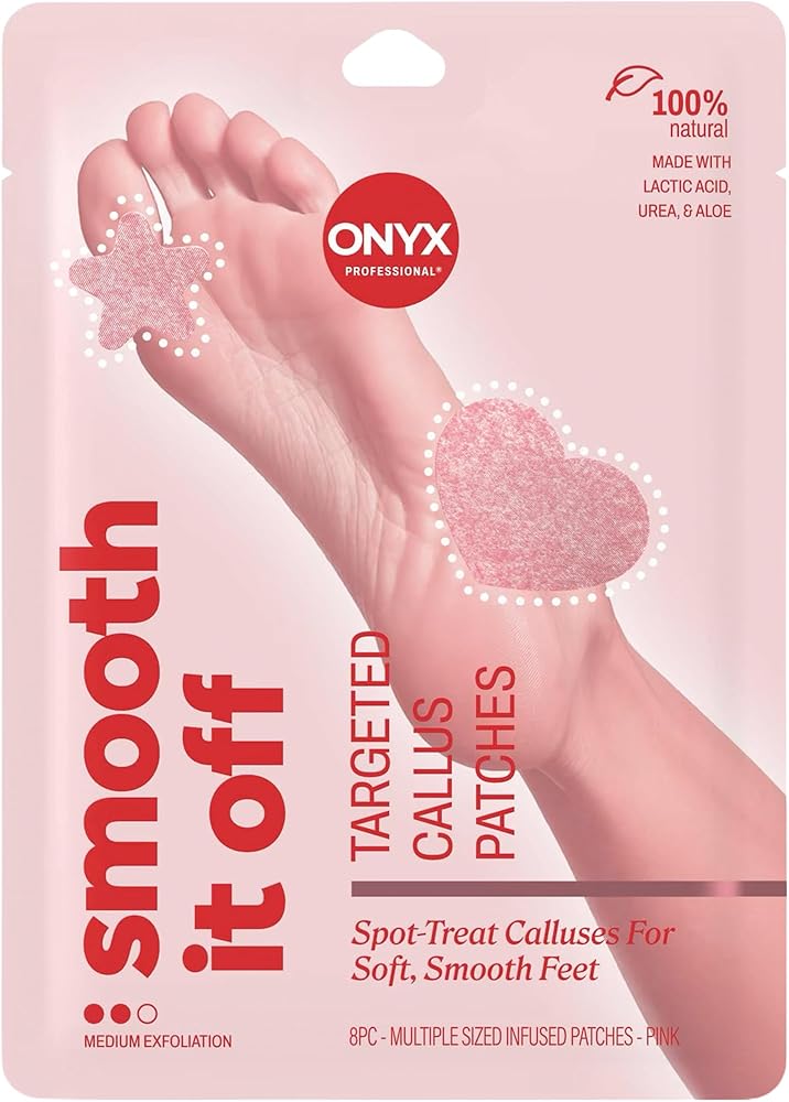 Who said foot care can't be cute? Meet your new solemate: the ONYX Professional Smooth It Off Callus Patches. These pink heart- and star-shaped hydrogel patches soften rough spots with Lactic Acid (AHA), hydrate with Urea, and soothe with Aloe and Vitamin E for softer, smoother skin. These heart- and star‑shaped hydrogel patches transform the way you treat calluses and cracked heels, combining dermatologist‑favored ingredients with a fun, mess‑free design. Each patch delivers a powerful blend of Lactic Acid (AHA) to gently exfoliate dead skin, Urea to deeply hydrate dry, rough areas, and Aloe + Vitamin E to soothe and nourish irritated spots. Whether you're dealing with stubborn calluses, dry heels, or need a quick foot cracked heel repair boost, these patches make targeted treatment effortless. Simply stick on, go about your day, and peel off softer, smoother skin. Perfect for weekly maintenance, travel, or anytime your feet need a little TLC. Use them as heel bandages, callus remover support, or part of a full cracked heel treatment routine.