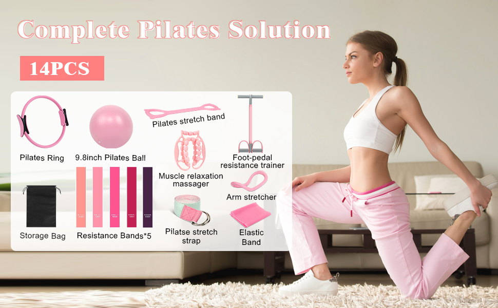 • 14-Piece Complete Home Pilates Kit for Full-Body Training:This 14 pcs all-in-one Pilates kit includes a Pilates ball, Pilates ring, upgraded 8-shaped pull band, 360° massage roller, Pilates stretch band, stretch strap, 5 TPE resistance bands, and a waterproof carry bag. Each accessory targets different muscle groups, helping you tone, strengthen, stretch, and recover from head to toe—anytime, anywhere.
