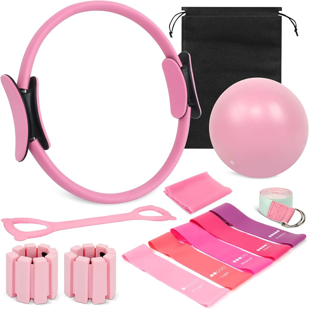 Home Pilates Essentials Kit for Women, Complete 13-in-1 Pilates Equipment Ring and Ball Set with 5 TPE Resistance Bands, Ankle Weights, 8-Shaped Pull Band, Stretch Strap and Waterproof Bag