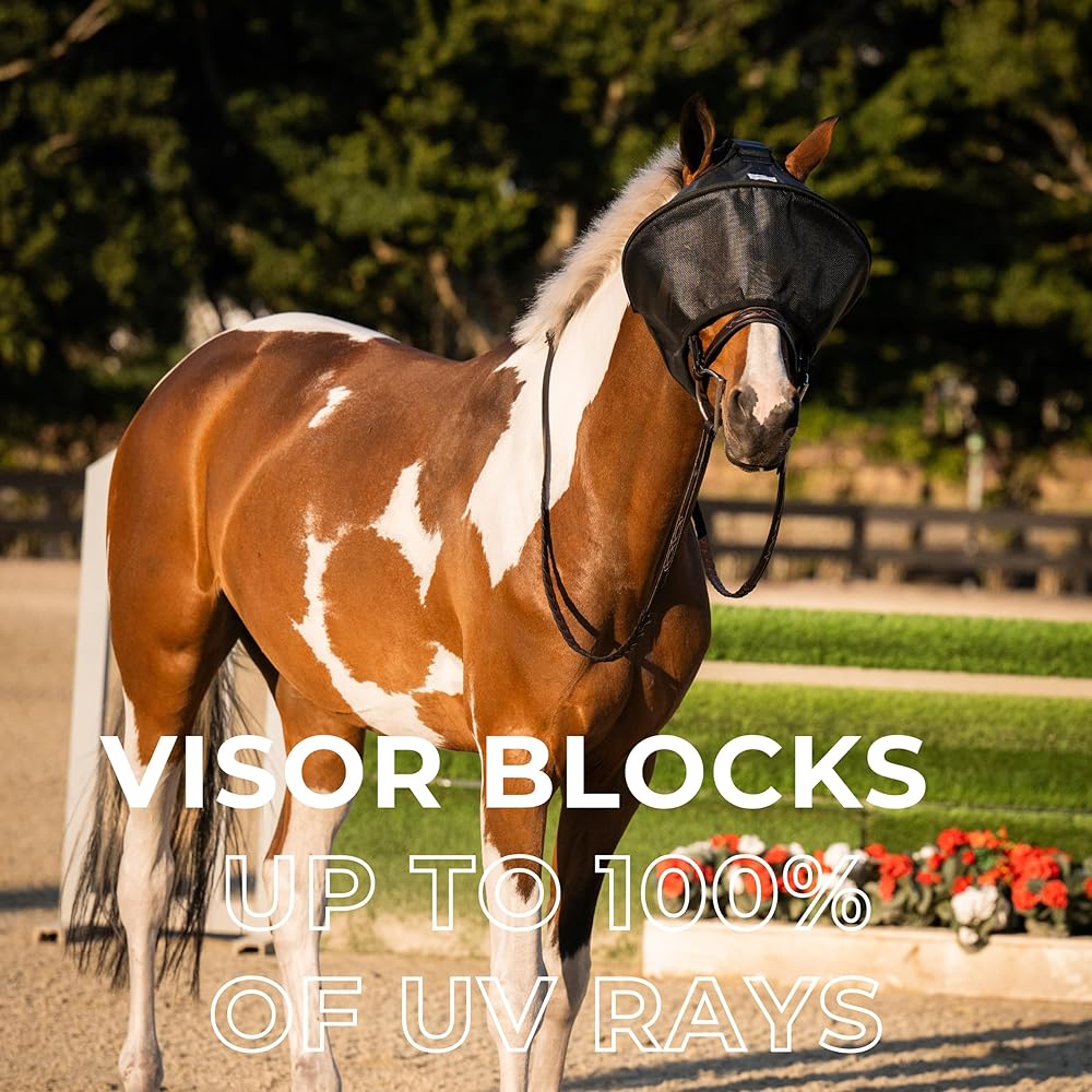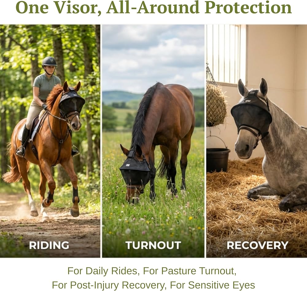 Visor-Style Fly Mask Coverage – Curved horse visor blocks sunlight, wind, dust, and airborne debris without full face mesh. Designed for airflow and visibility while riding, training, or daily use.