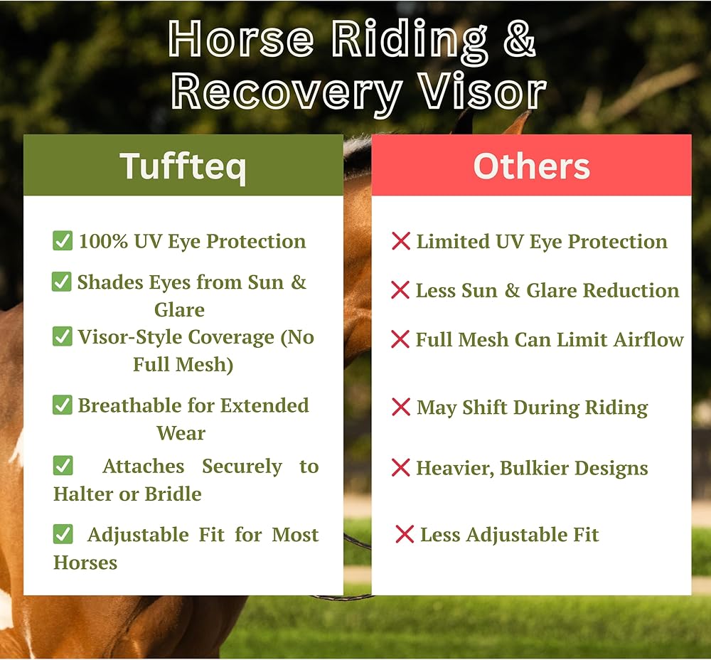 Protect your horse's eyes during riding and recovery with the TUFFTEQ Horse Visor. This full-coverage visor blocks 100% of UVA and UVB rays while shielding eyes from dust, wind, and debris. A secure strap attaches easily to a halter or bridle, keeping the visor in place without restricting vision or movement. The adjustable design fits most horse sizes, making it ideal for horses with eye sensitivity, light-colored eyes, or those needing extra protection after riding. Lightweight, breathable, and durable, this visor provides comfort and reliable protection for everyday riding, turnout, and post-ride recovery.