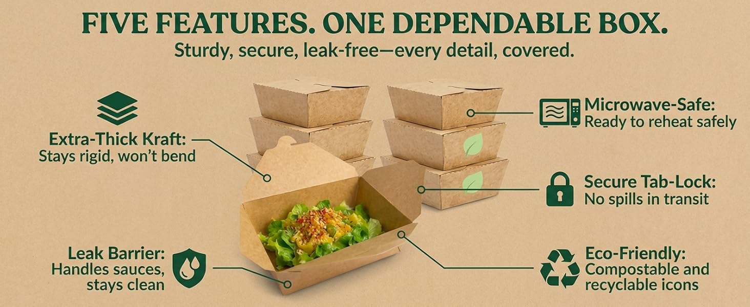 🌱 ورق كرافت صديق للبيئة مصنوع من ورق كرافت متين، حاويات الطعام المصنوعة من الورق المقوى هذه هي بديل صديق للبيئة للبلاستيك مع الحفاظ على القوة والموثوقية للاستخدام اليومي في خدمة الطعام.