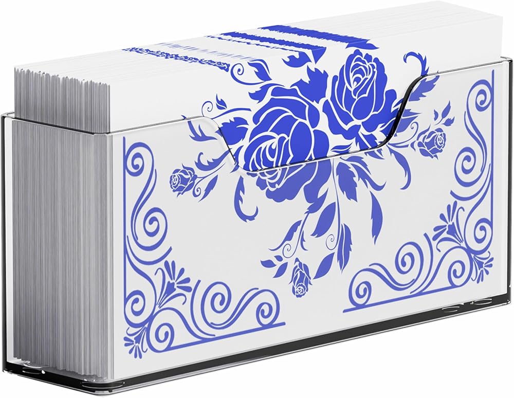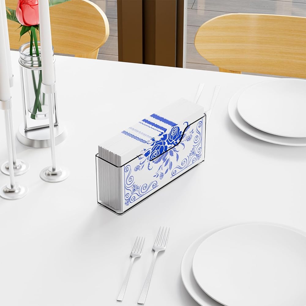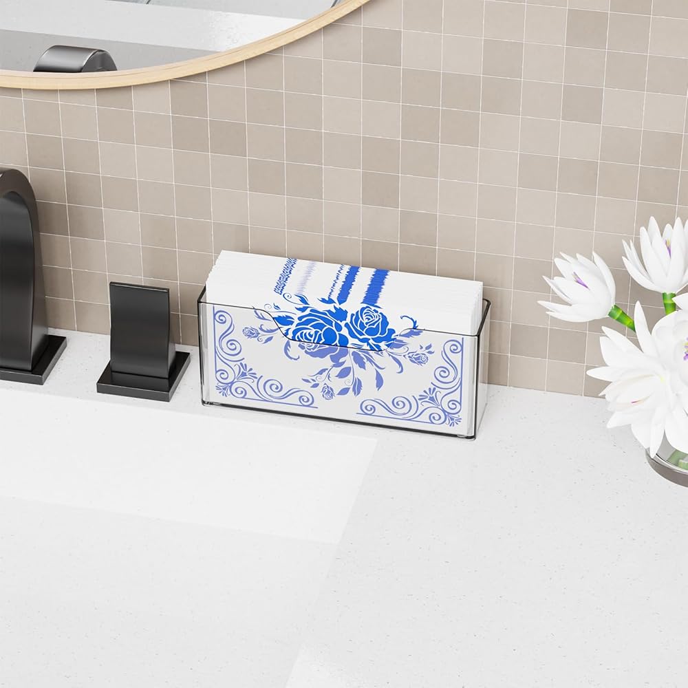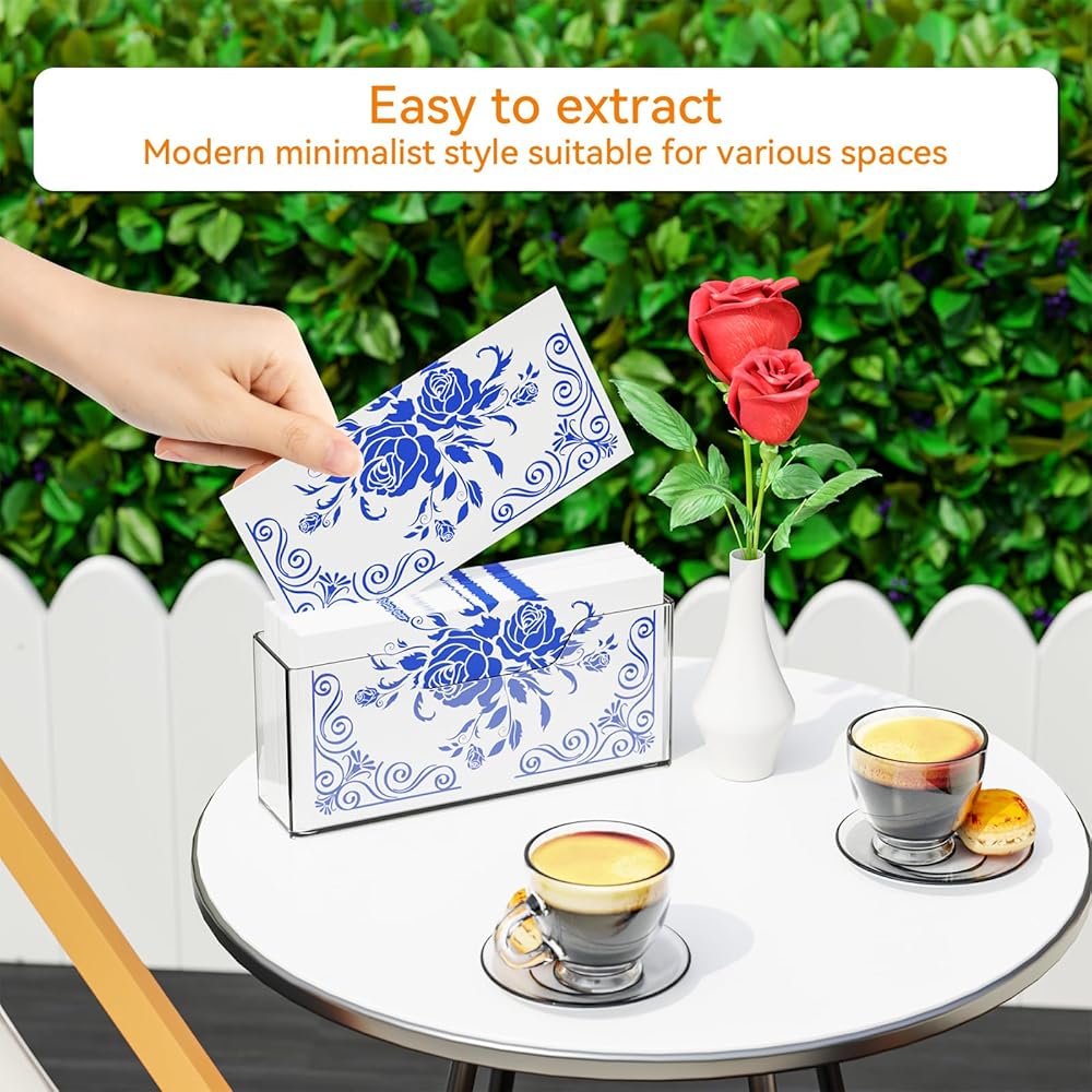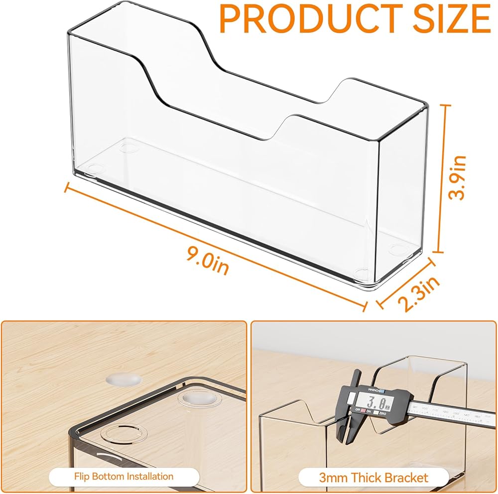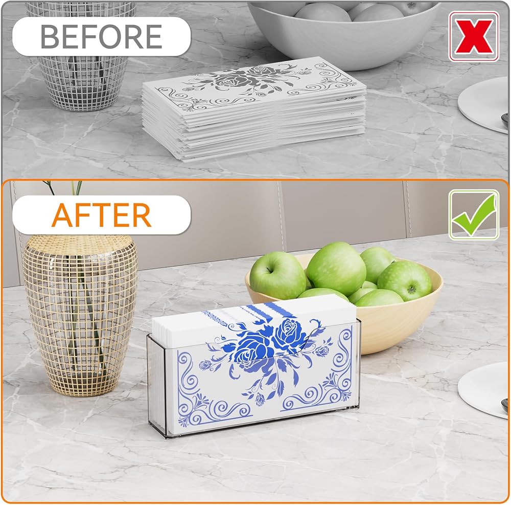 【تصميم عالمي】حامل المناديل الشفاف عريض بما يكفي لحمل الكثير من المناشف التي تستخدم لمرة واحدة، مقاس 9 بوصة طول × 2.3 بوصة عرض × 3.9 بوصة ارتفاع، ويمكنه حمل مناديل العشاء المطوية مقاس 7.5 بوصة × 4.25 بوصة ومناشف يد الضيوف المطوية التي تستخدم لمرة واحدة مقاس 8.5 بوصة × 4.25 بوصة