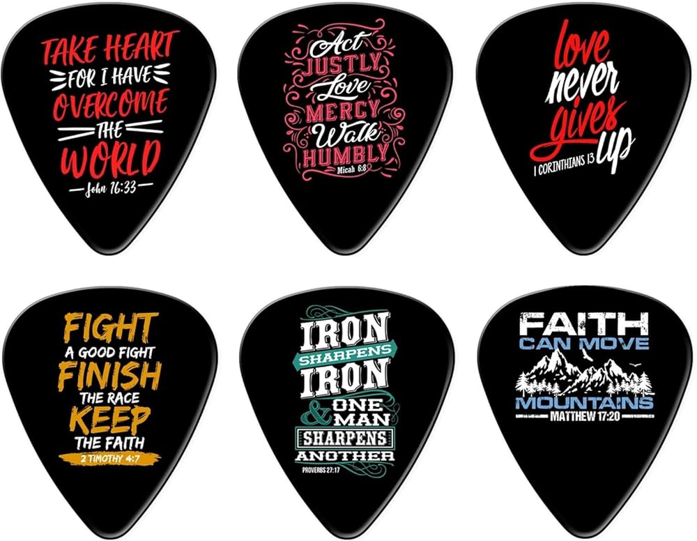 Express your faith through music with this inspiring collection of 12 guitar picks featuring powerful Bible verses and scripture quotes.