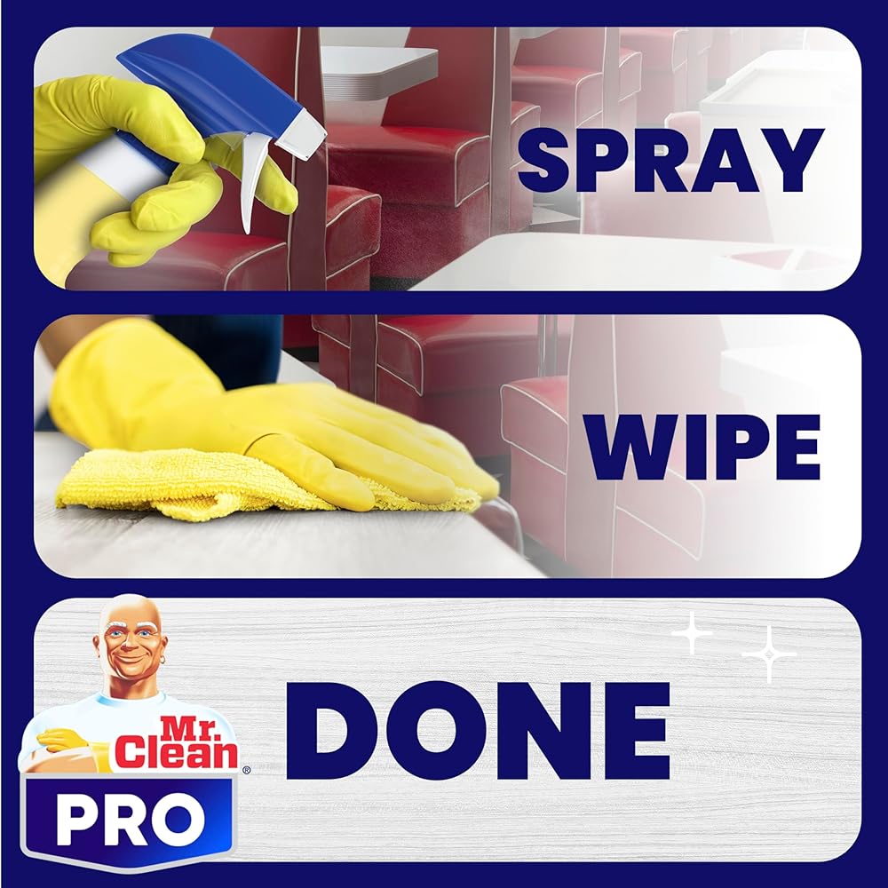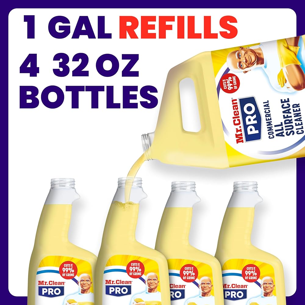 Introducing Mr. Clean PRO All Surface Cleaner, commercial grade solution for tackling tough commercial grime! This surface cleaning liquid is designed to cut through up to 99% of stubborn dirt and grime found in high-traffic areas, guest rooms, and various surfaces throughout your business. Whether you are cleaning front of the house or bathrooms, Mr. Clean PRO picks up commercial grime that gets left behind. With its commercial grade formula, this surface cleaner features powerful cleaning agents that effectively trap, lift, and remove commercial grime that often accumulates on sinks, counters, walls, glass, and more. Mr. Clean PRO Commercial All Surface Cleaner is suitable for use on a wide range of hard surfaces, making it incredibly versatile. It works on stainless steel, laminate, granite, and porcelain, and more. This cleaner works on glass, mirrors, and fiberglass. Whether you're maintaining cleanliness in a busy hotel, restaurant, or office, Mr. Clean PRO is a must-have surface cleaner for your business. This cleaner comes in convenient 32 oz spray bottle as well as 1 gallon bottle that refills 4 32 oz spray bottles. Just spray it on the surface and wipe it off. Experience the difference with Mr. Clean PRO, and elevate your cleaning routine to new heights!