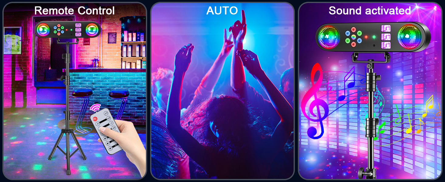 3 أوضاع للتحكم: تحتوي مصابيح دي جي للحفلات على 3 أوضاع تحكم، تلقائي، التحكم الصوتي، التحكم عن بعد، أضواء المسرح الخاصة بنا لا يمكنها فقط ضبط الوضع التلقائي، أو التحكم عن بعد، أو وضع التثبيط أو التحكم الصوتي، وفقًا لتغيير الموسيقى تلقائيًا تغيير تأثير الإضاءة، حرر يديك
