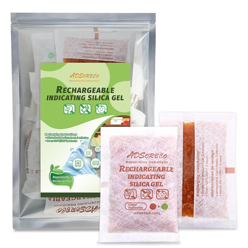 Keep your valuables in optimal condition with Adsorbco 500-gram silica gel desiccant packs. Designed to help maintain a stable environment in enclosed spaces, these packs are ideal for protecting documents, books, jewelry, electronics, camera lenses, tools, and more. Each pack is made with high-quality non-woven fabric, providing excellent breathability while ensuring durability. The orange silica gel beads efficiently regulate conditions, while the orange indicating beads change to dark green when they need to be refreshed. These silica gel packs are rechargeable and reusable. Simply place them in an oven at 230-250°F (110-120°C) for up to 1 hour to restore their original effectiveness. The ziplock-sealed outer bag makes storage easy and convenient. Perfect for use in home, office, storage containers, toolboxes, safes, and industrial applications, these silica gel packs offer long-lasting performance with a simple color indicator for monitoring.