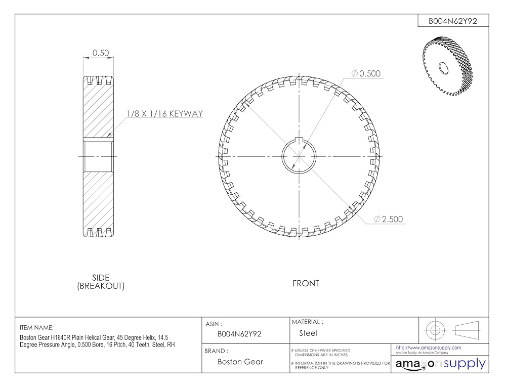 بوسطن جير H1640R تروس حلزونية عادية، حلزوني 45 درجة، زاوية ضغط 14.5 درجة، 0.500 تجويف، 16 خطوة، 40 سن، فولاذ، RH