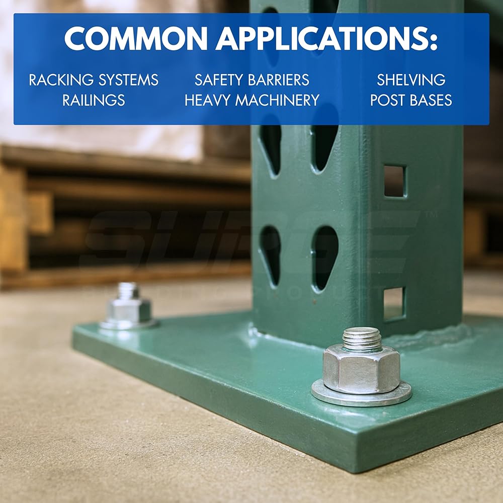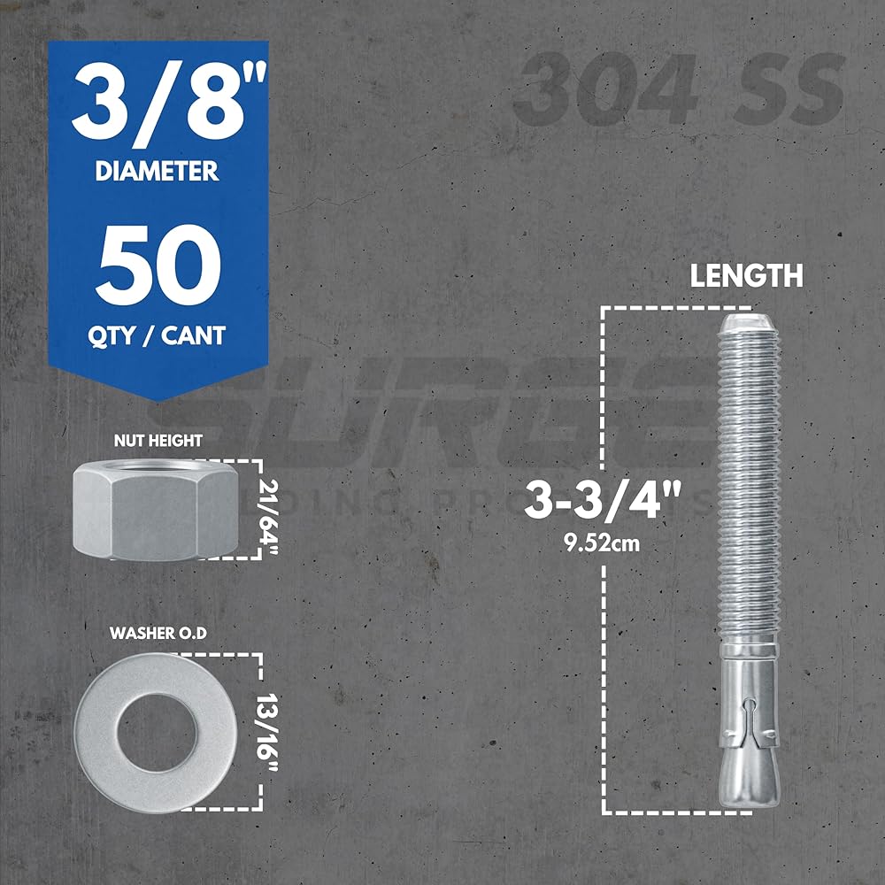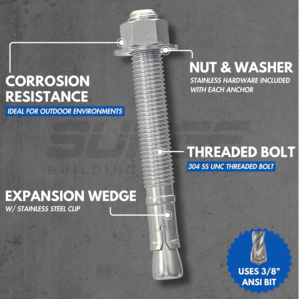 Surge Building Products' 304 stainless steel wedge anchors are heavy-duty, wedge-style expansion anchors designed for secure, long-lasting fastening in solid concrete, fully grouted block, and cement. These torque-controlled anchor bolts for concrete deliver consistent, dependable performance, making them ideal for a wide range of exterior anchoring applications—especially where corrosion resistance matters. Each concrete anchor is built with a 304 stainless steel body for excellent durability and rust resistance. A stainless hex nut and washer are included with every anchor so you can install fast and securely without needing extra hardware. These 304 stainless concrete anchors are commonly used for both commercial and residential fastening needs including warehouse racking, post and column base plates, guardrails and handrails, railings, safety barriers, equipment mounts, electrical and mechanical supports, and other heavy-duty fixtures anchored into concrete.