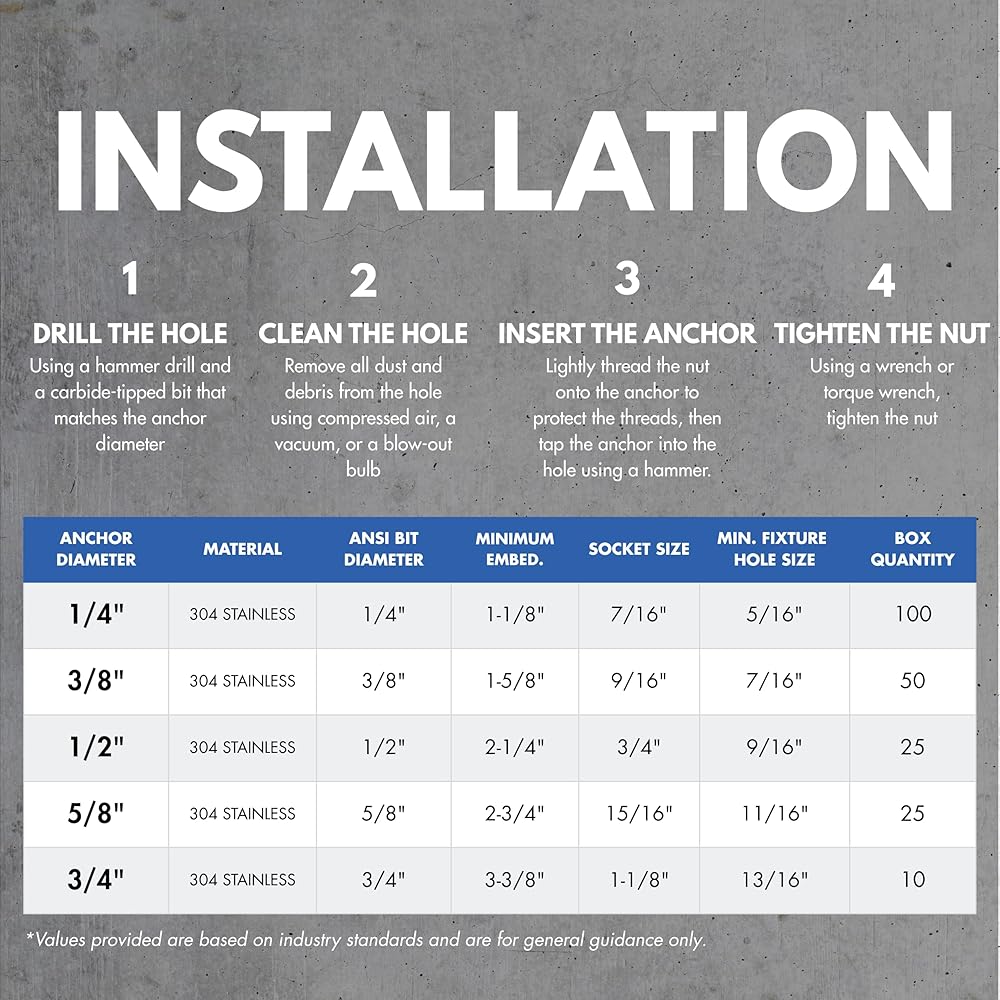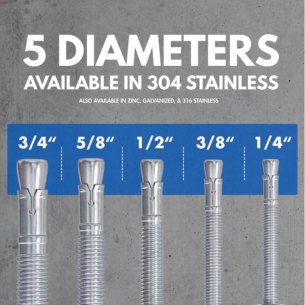 304 STAINLESS FOR CORROSION RESISTANCE – Stainless steel concrete anchors designed to help resist rust and corrosion in indoor and many outdoor environments, including damp, wet, and coastal areas.