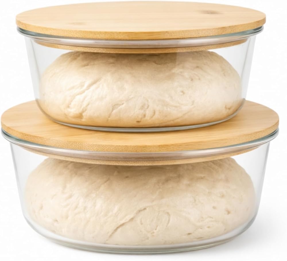 Made of high-borosilicate glass with airtight bamboo lids, these containers keep dough moist and fresh. The clear design lets you monitor rising, while the stackable 950ml and 1300ml jars save space and are dishwasher-safe. Ideal for sourdough, pizza prep, or kitchen storage, Mowhut makes baking simpler.