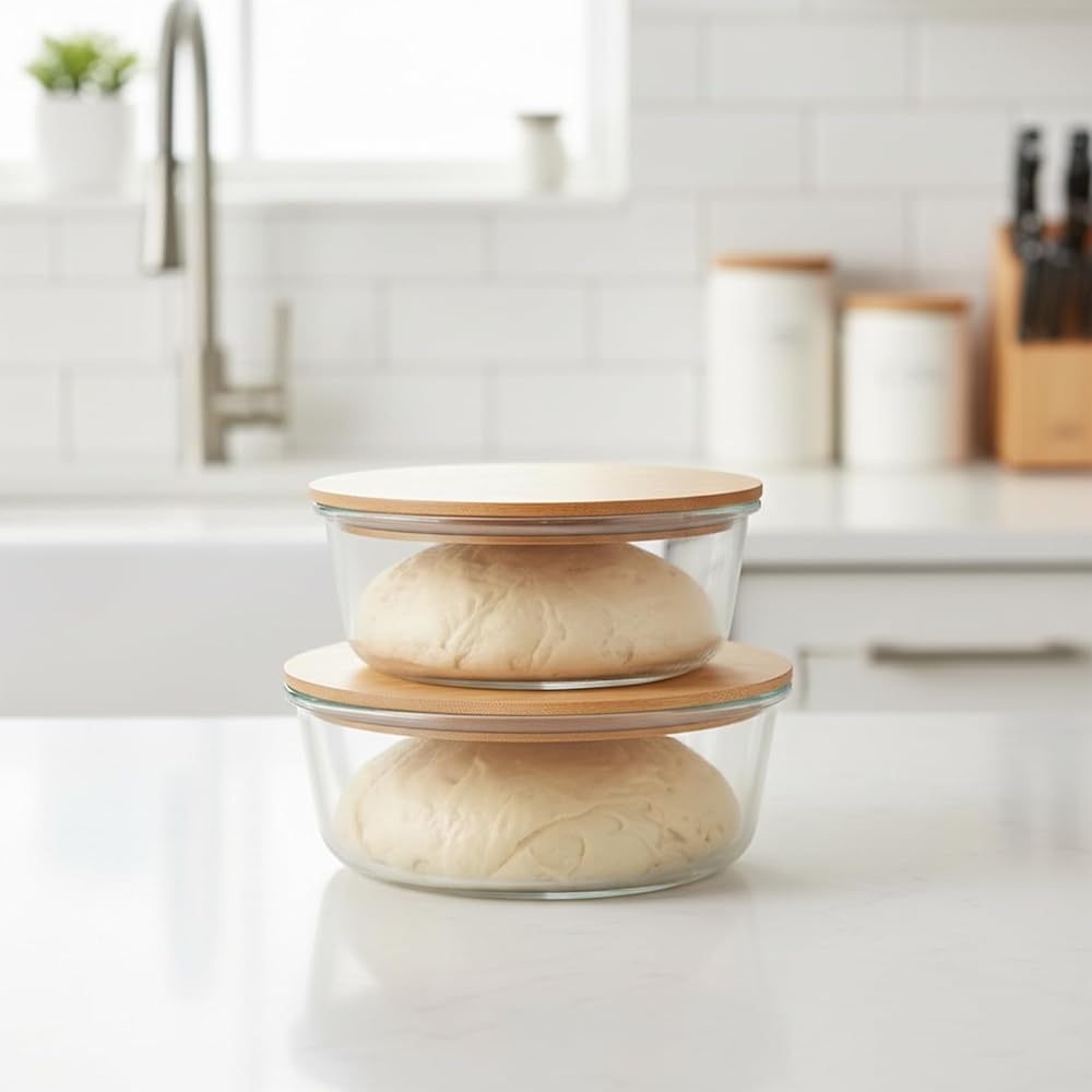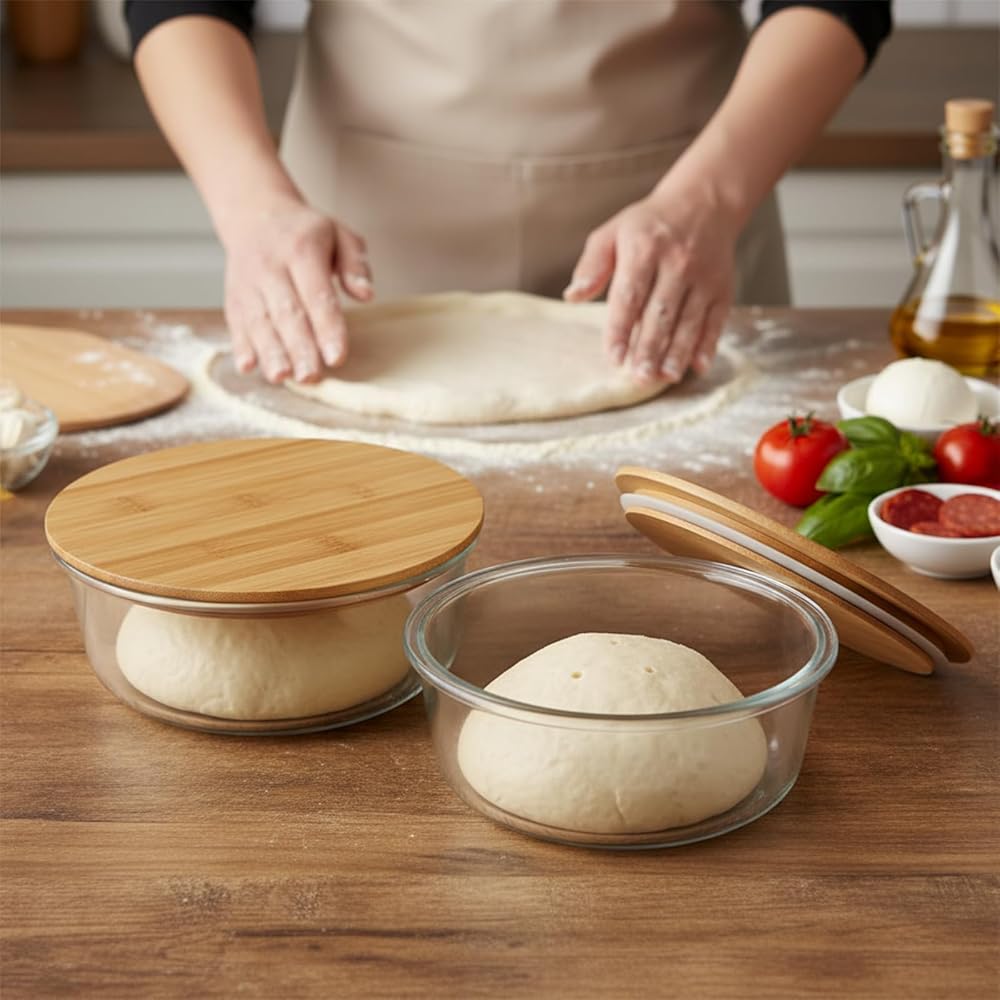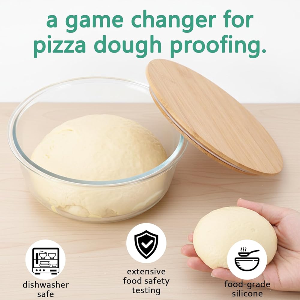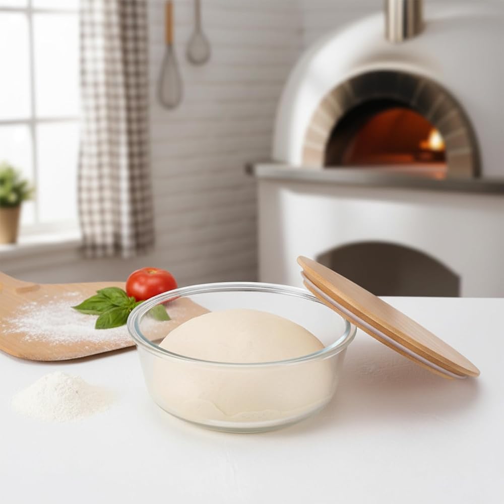 【Premium & Safe Materials】Made from high-borosilicate glass and a bamboo wood lid, this thick, food-grade pizza dough container is impact-resistant, heat-tolerant, and offers a safer, more durable surface for food contact.