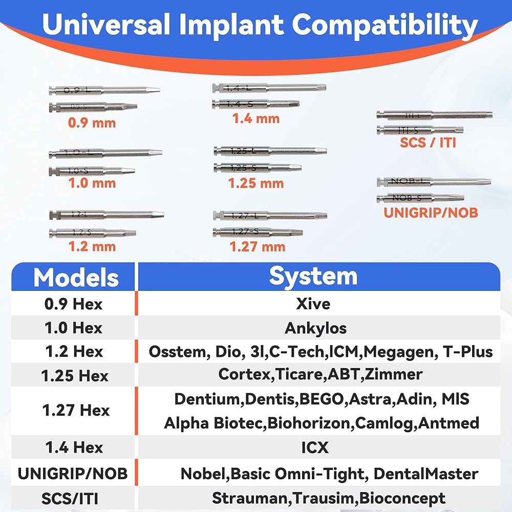 【Universal Implant Compatibility】: Works with all major brands using 16 included screwdriver heads (8 long + 8 short). Covers Hex (0.9-1.4mm) 0.9 Hex, 1.0 Hex, 1.2 Hex, 1.25Hex, 1.27Hex, 1.4 Hex