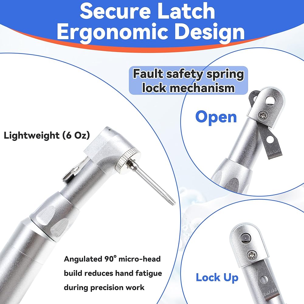 【Secure Latch & Ergonomic Design】: The fail safe spring lock mechanism can prevent the screwdriver heads from falling off during surgery.Angulated 90° micro-head + lightweight (170g) build reduces hand fatigue during precision work.