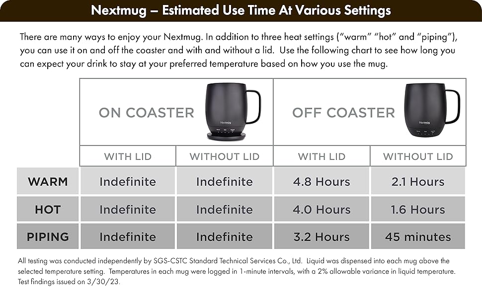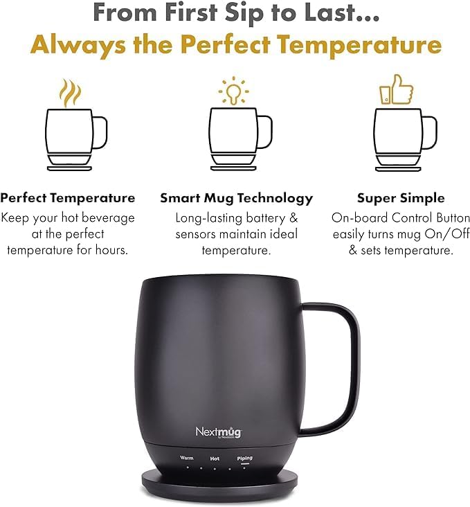 درجة الحرارة المثالية دائمًا - سوف يحافظ Nextmug على قهوتك الساخنة أو الشاي أو مشروبك المفضل في درجة حرارة مثالية أينما كنت. ما عليك سوى اختيار دافئ (130 درجة فهرنهايت)، أو ساخن (140 درجة فهرنهايت)، أو الأنابيب (150 درجة فهرنهايت) واستمتع لساعات.