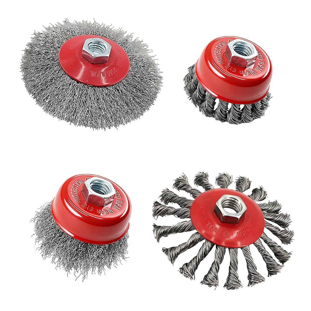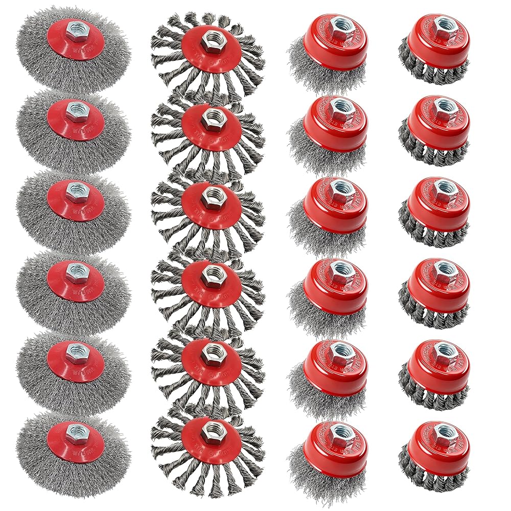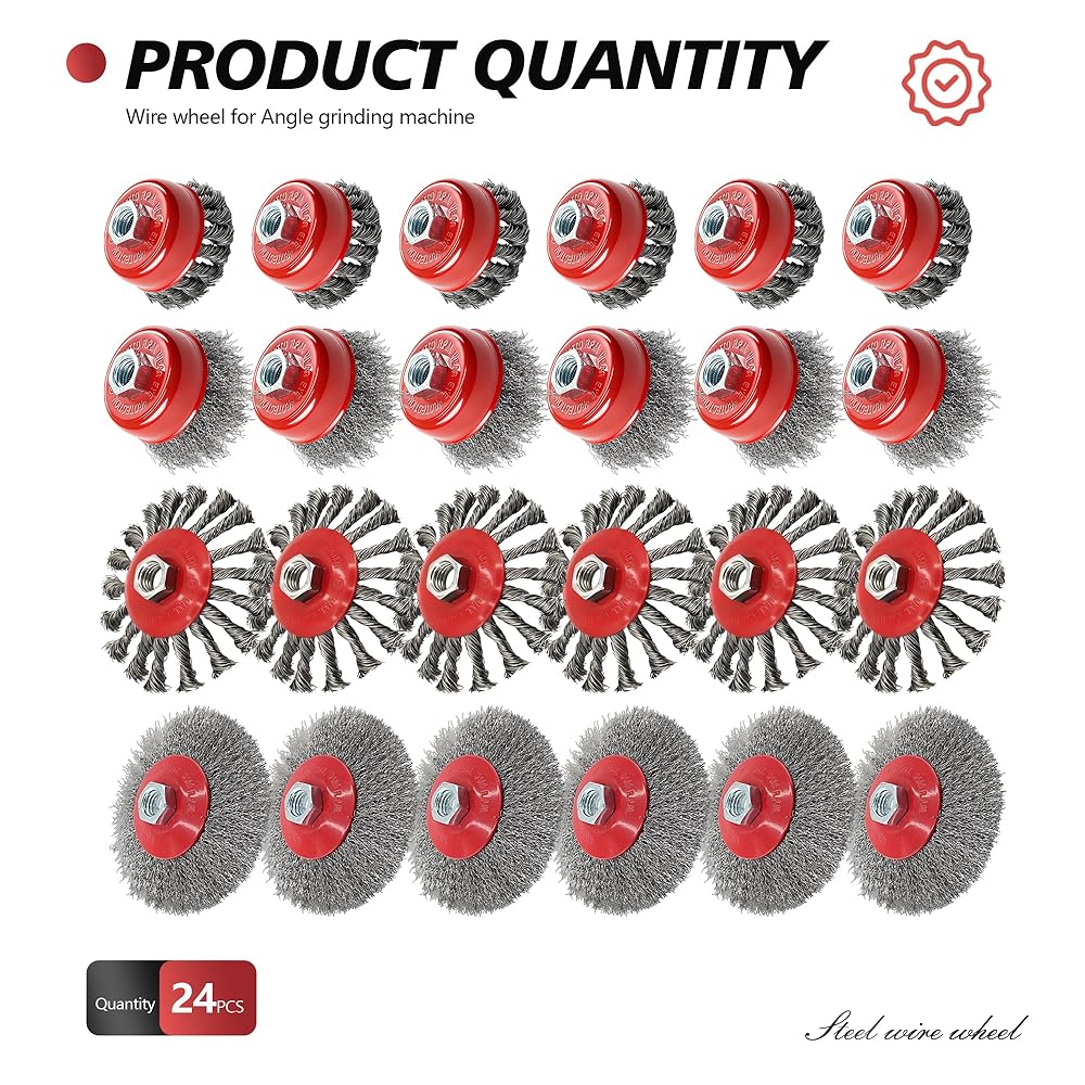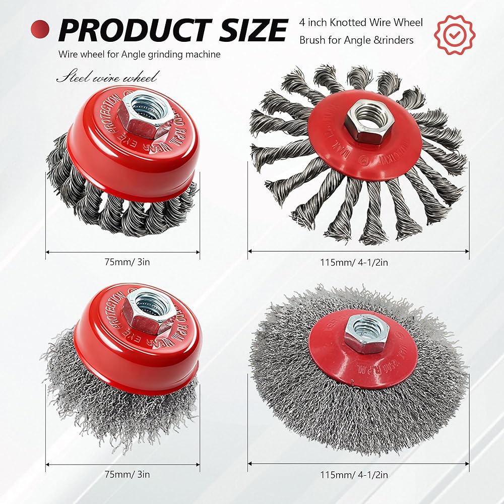 • Pack included: 6Pcs 4-1/2” knotted wire wheel, 6Pcs 4-1/2” coarse crimped wire wheel, 6Pcs 3” knotted wire cup, 6Pcs 3” coarse crimped wire cup. The combination of 4 different sizes of wire wheels and cup brushes allows you to easily handle various polishing work scenarios.