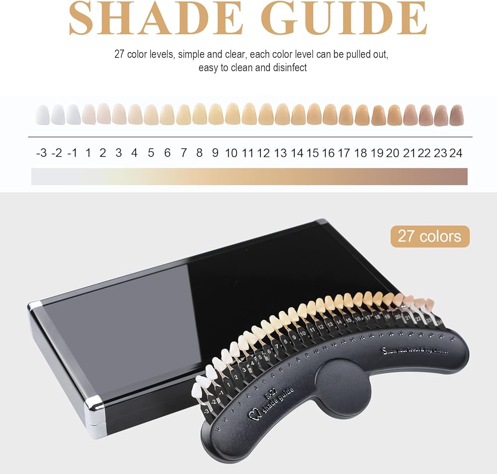 27 Colors shades with engraved numbering for longer use. Quick, secure and precise shade determination.