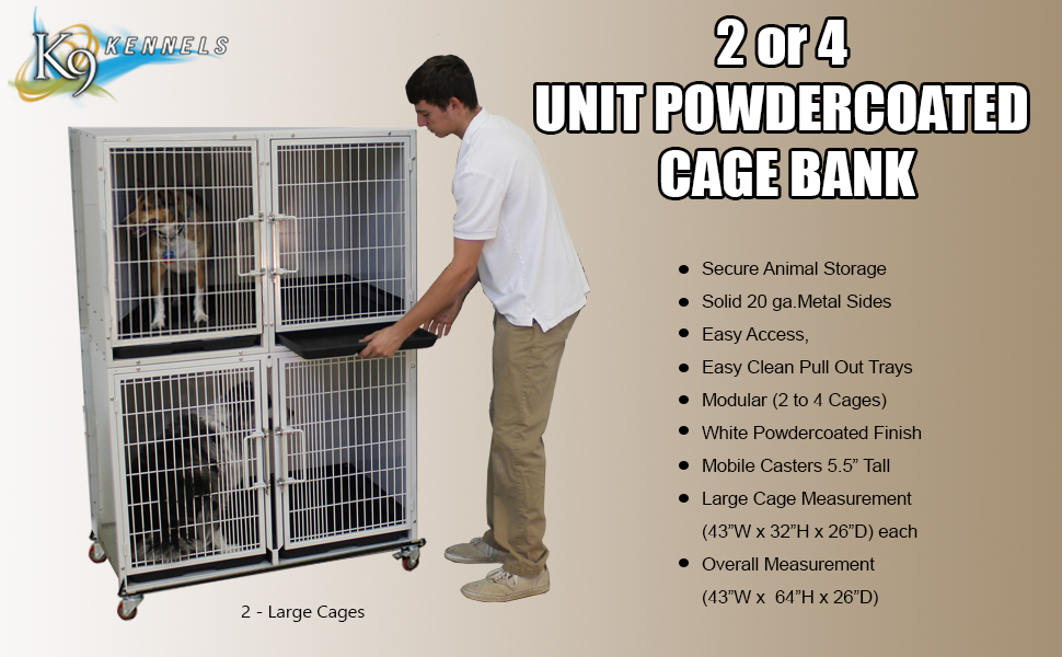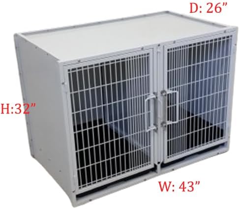 يشتمل على: (2) حصانات قفص كبيرة مطلية بمسحوق (2) ألواح مقسمة (تستخدم لتقسيم القفص الكبير إلى قفصين متوسطين) الحجم الإجمالي: 43 بوصة عرض × 64 بوصة ارتفاع × 26 بوصة عمق العجلات: الارتفاع = 5.5 بوصة