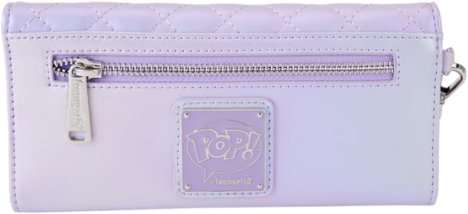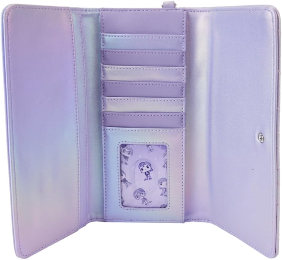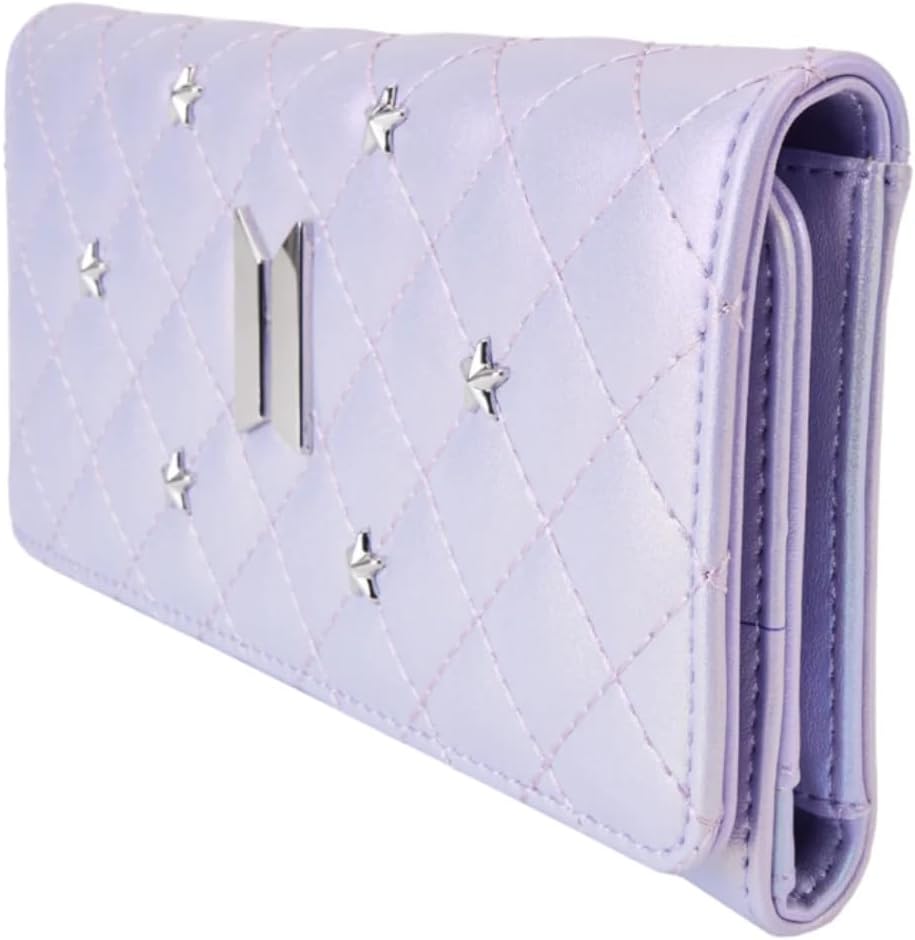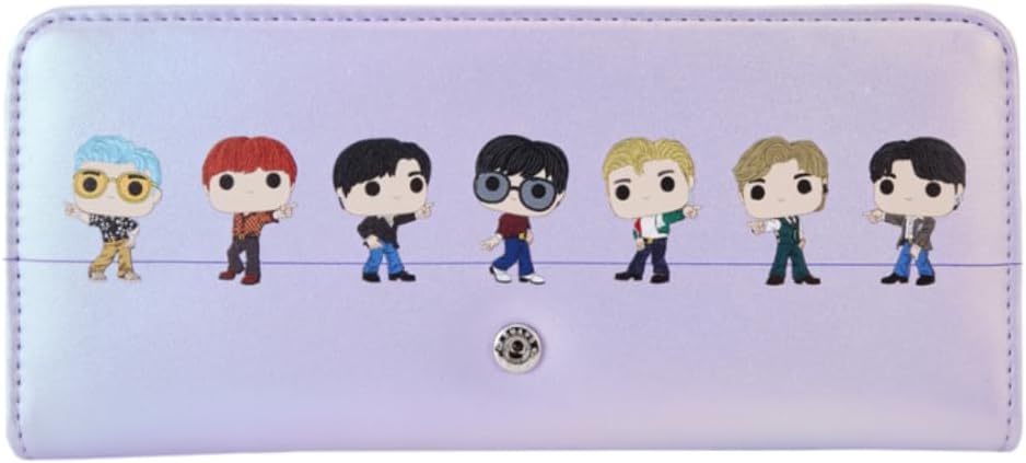The Loungefly BTS Pop! by Loungefly Trifold Wallet is made of vegan leather (polyurethane). Wallet snaps shut with silver-colored metal hardware. Additional features include debossed, quilted, molded metal charm, iridescent, and printed details. Take note of the coordinating inside lining.