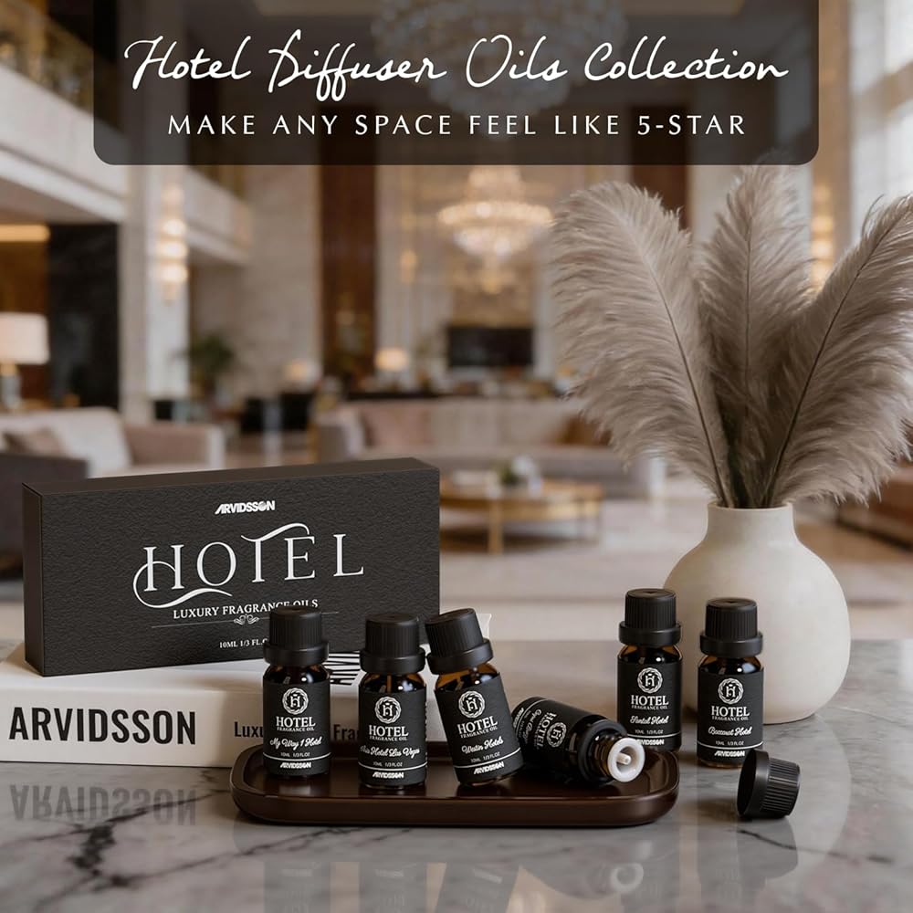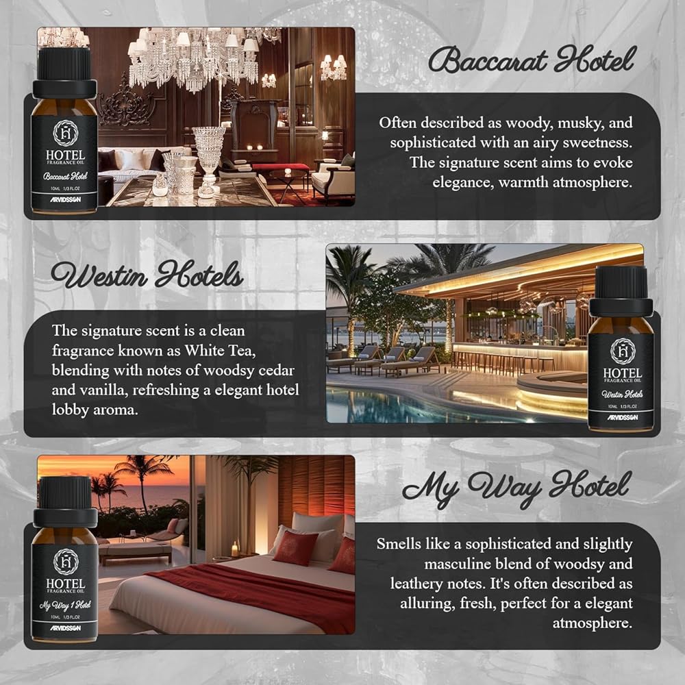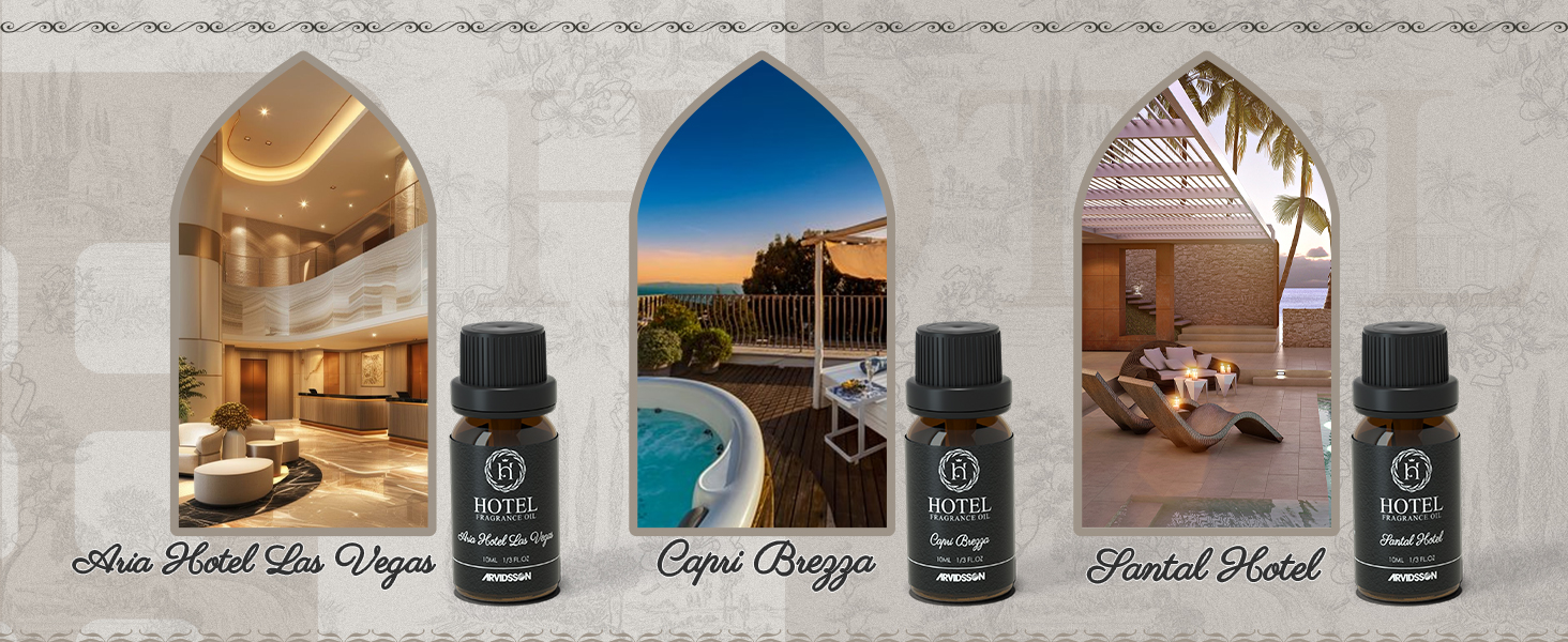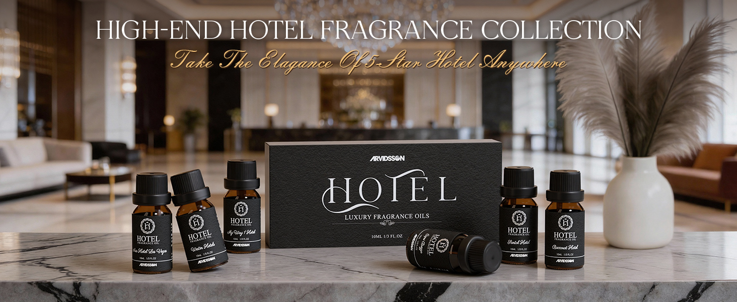 روائح الفنادق - تحفة حسية، تحول مساحتك إلى مزيج من الفخامة والفن. املأ عالمك بالأجواء الفاخرة للأناقة والاسترخاء البعيدين من خلال مجموعتنا من الزيوت العطرية المستوحاة من الفنادق.