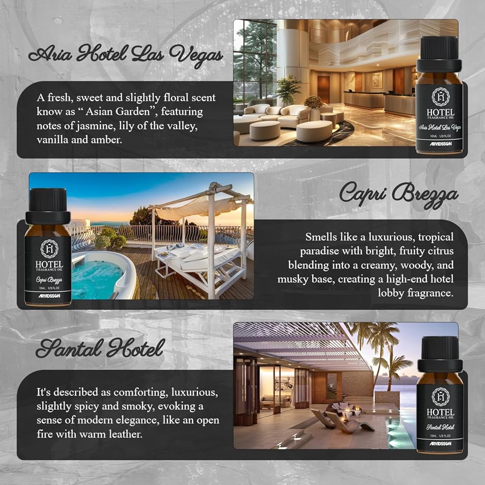 اجعل أي مساحة تبدو وكأنها فندق 5 نجوم مثالي: انغمس في مجموعتنا الواسعة من الزيوت المعطرة للفنادق، كل واحدة منها مصنوعة من أجود المكونات لتقديم تجربة حسية فريدة من نوعها. ارفع مساحتك باستخدام الزيوت العطرية من مجموعتنا الفندقية الفاخرة اليوم!
