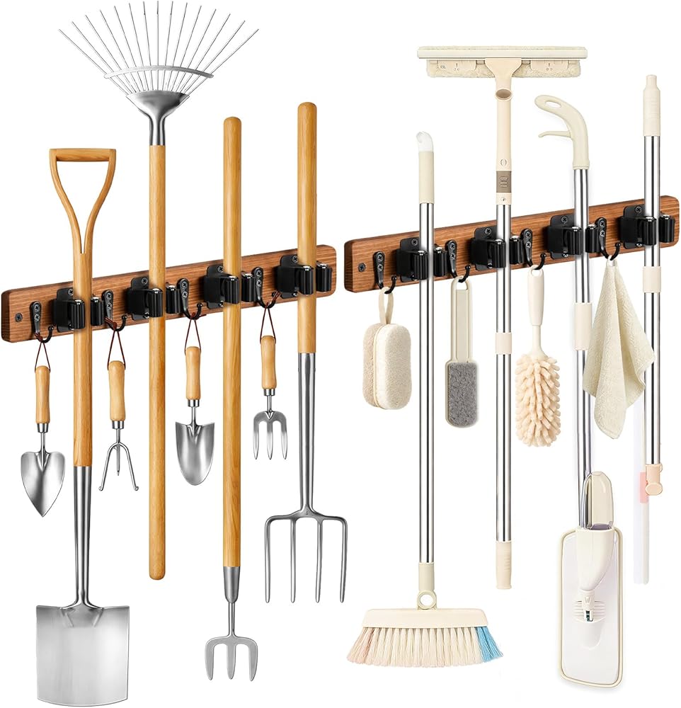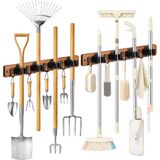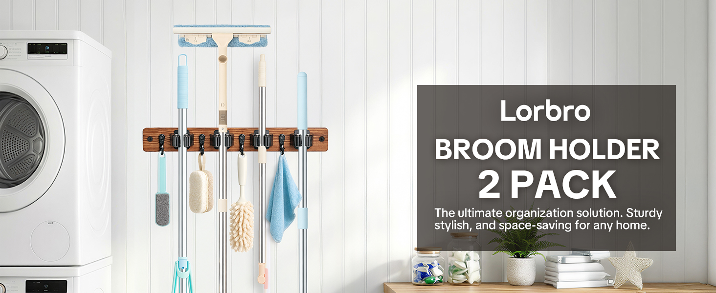 Lorbro 2 حزمة حامل المكنسة على الحائط، مكنسة خشبية ومنظم ممسحة للتعليق على الحائط، رف شماعات ممسحة مع 4 فتحات و4 خطافات، منظم أدوات لغرفة الغسيل، الخزانة، المرآب، المطبخ