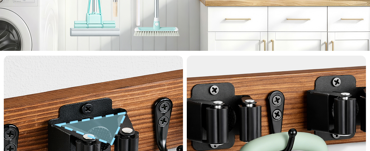 • إعداد سهل التركيب: يأتي كحامل مكنسة وممسحة مع فتحات تثبيت محاذاة مسبقًا وأدوات متضمنة، مما يسمح بالتركيب السريع على الجدار الجاف أو الأزرار دون خطوات معقدة، مما يجعل الإعداد بسيطًا حتى بالنسبة للمستخدمين لأول مرة