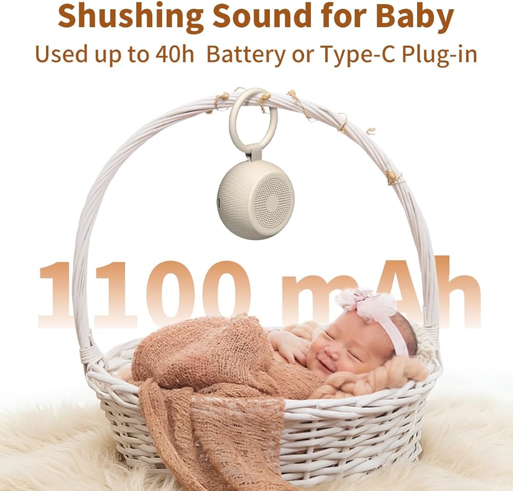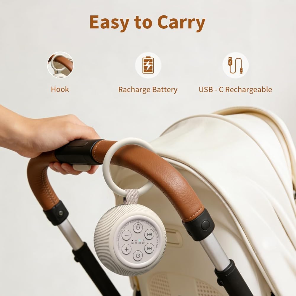 ❤【Portable Travel Sound Machine】Sleep sound machine, a rechargeable battery-powered compact white noise machine with hushing sound for baby. A small-sized high-quality sound machine with the strongest volume. It has a hook for easy installation on baby strollers, cribs, car seats, etc., and can be easily placed in handbags or small backpacks. The speaker is at the top. The excellent sound effect can effectively mask noises, suitable for traveling, sleeping in hotels, camping, protecting privacy conversations in the office.