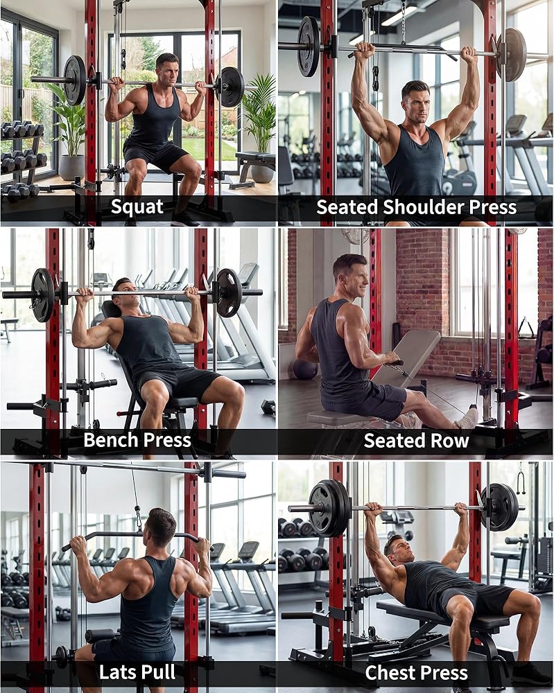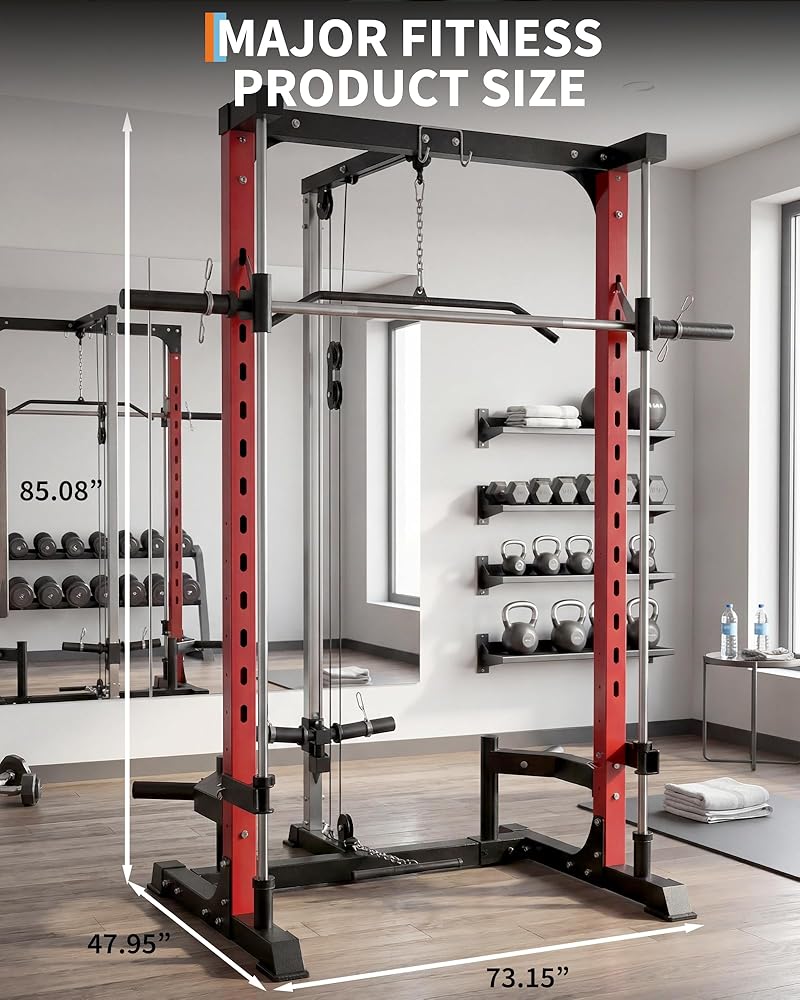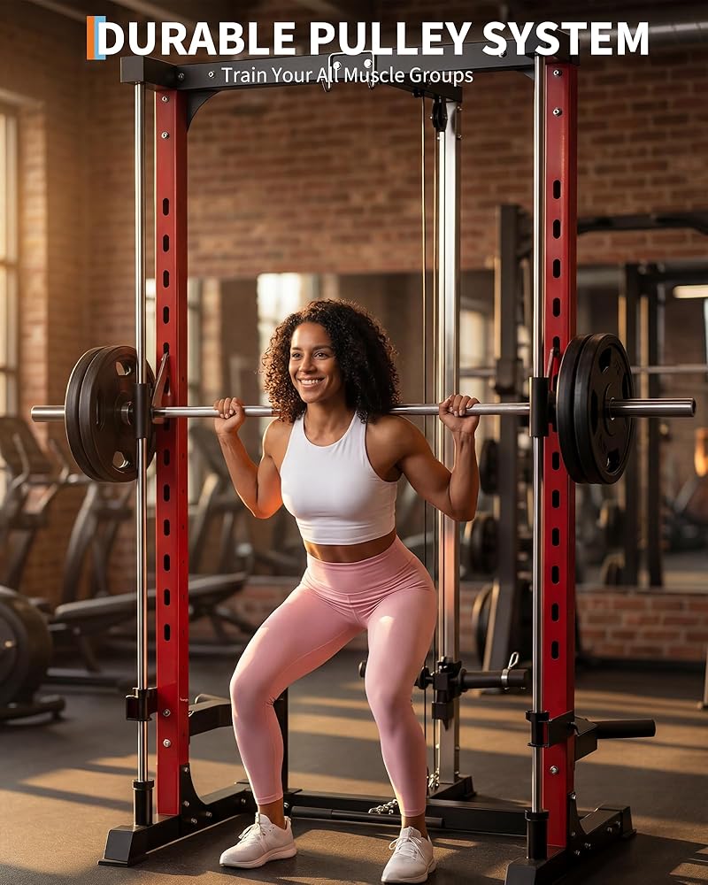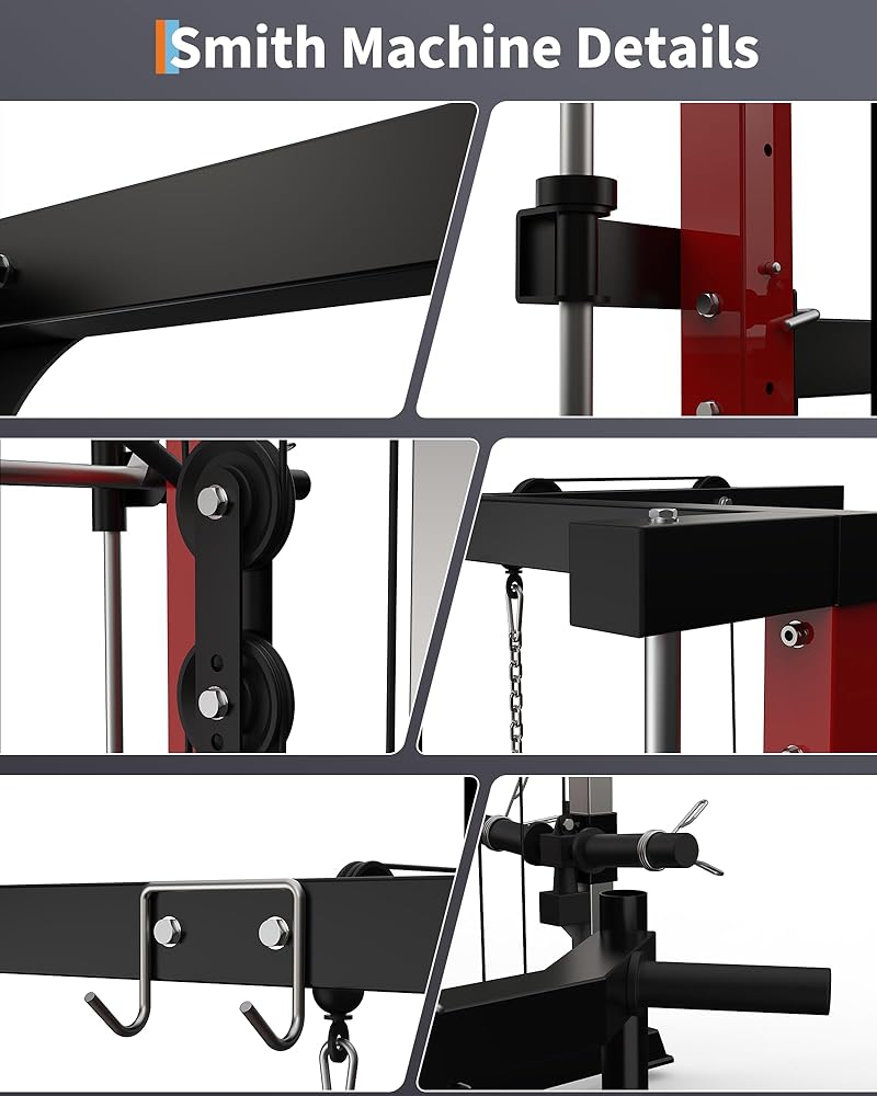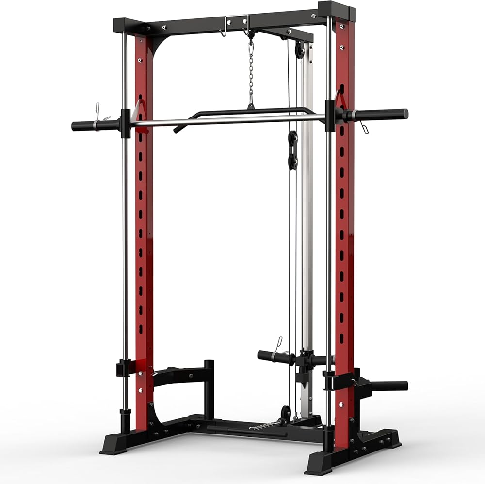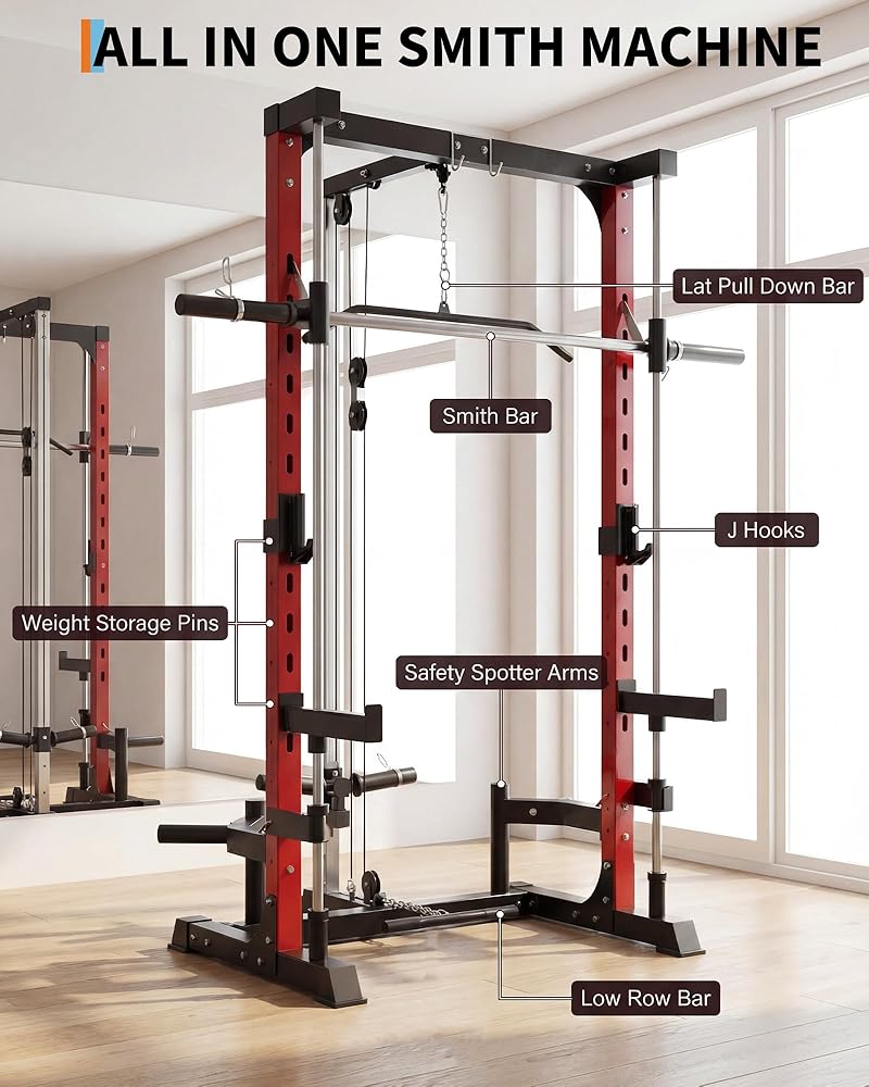 Upgrade your home gym with this smith machine, featuring a 1000 LB power cage squat rack with LAT pulldown and a range of essential attachments for comprehensive strength training. Built from heavy-duty carbon steel, this equipment provides stability and lasting performance for exercises like squats, bench presses, seated shoulder presses, chest presses, pulldowns, and rows. The generously sized power rack supports safe and effective in-cage workouts, suitable for all fitness levels. A precision pulley system ensures smooth movement for both LAT pulldown and low row exercises, allowing you to target major muscle groups. The smith machine comes equipped with a smith bar, LAT pulldown bar, low row bar, safety spotter arms, and weight storage pins, keeping your workout gear organized and your training space efficient. Its compact design fits well in a variety of home gym spaces. All necessary components and easy-to-follow instructions are included for straightforward assembly. For safety, always assemble the machine according to the manual, place it on a stable surface, and check that all attachments are secure before each workout. This multi-functional power rack supports your strength training, weight lifting, and full-body exercise routines, offering professional-level performance and convenience for home use. Note: This product ships in two packages.