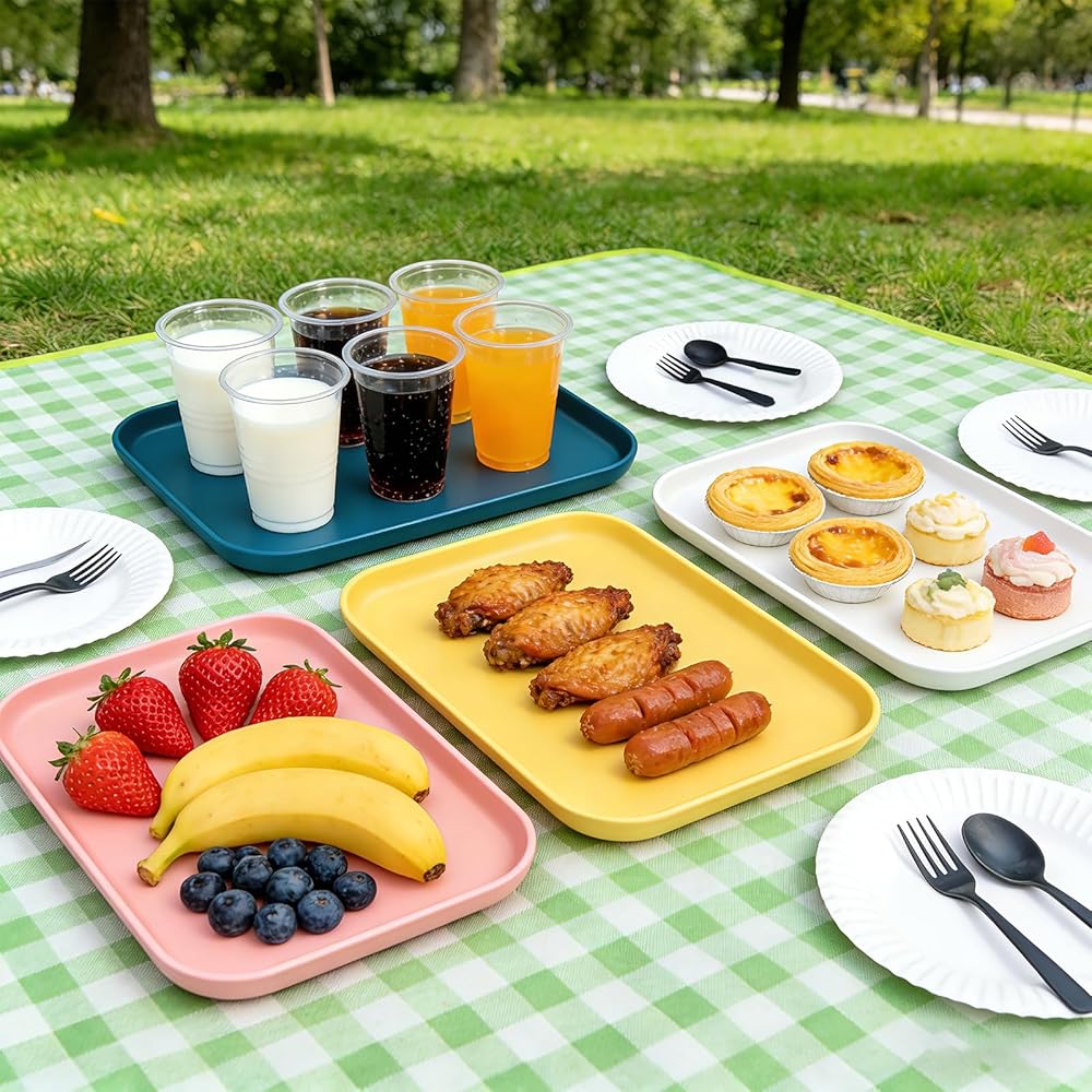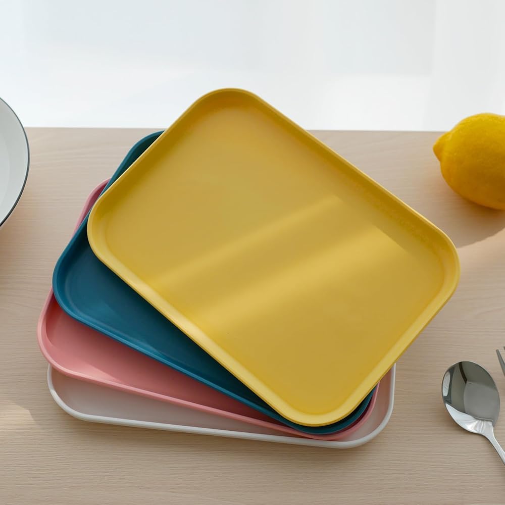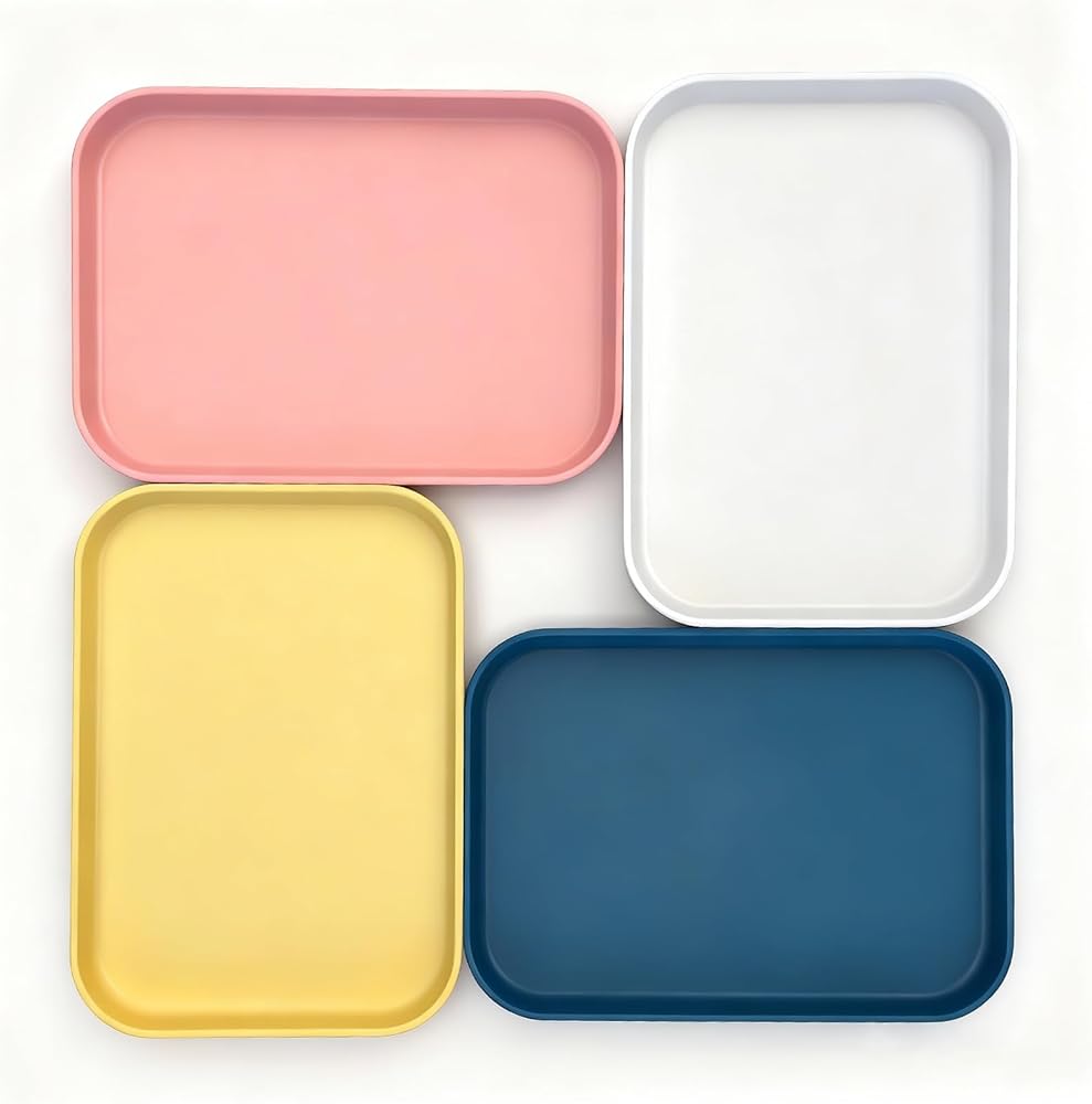 Elevate your entertaining game with this versatile set of colorful plastic serving platters. The collection includes four rectangular trays in crisp white, sunny yellow, soft pink, and deep navy blue—perfect for creating an eye-catching display at your next gathering. These lightweight yet sturdy serving dishes are ideal for presenting a variety of foods including appetizers, charcuterie arrangements, chips, candy, fresh fruit, sushi, and more. The smooth surface and raised edges prevent spills while making it easy to transport food from kitchen to table. The clean, modern design complements any table setting or decor style, making these trays equally suitable for casual family meals or special occasions. Their durable plastic construction ensures they're practical for everyday use, easy to clean, and conveniently stackable for space-saving storage. Add a pop of color to your table while keeping your favorite snacks and treats beautifully organized and accessible.
