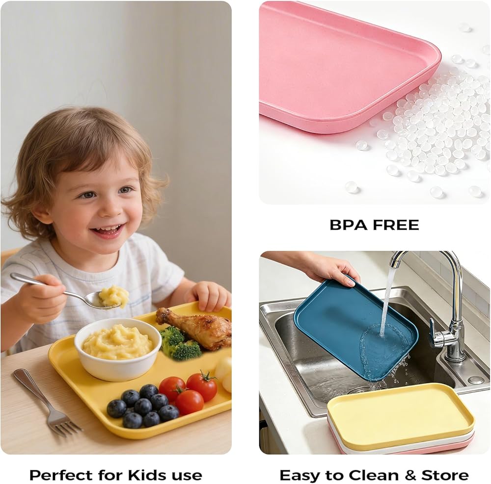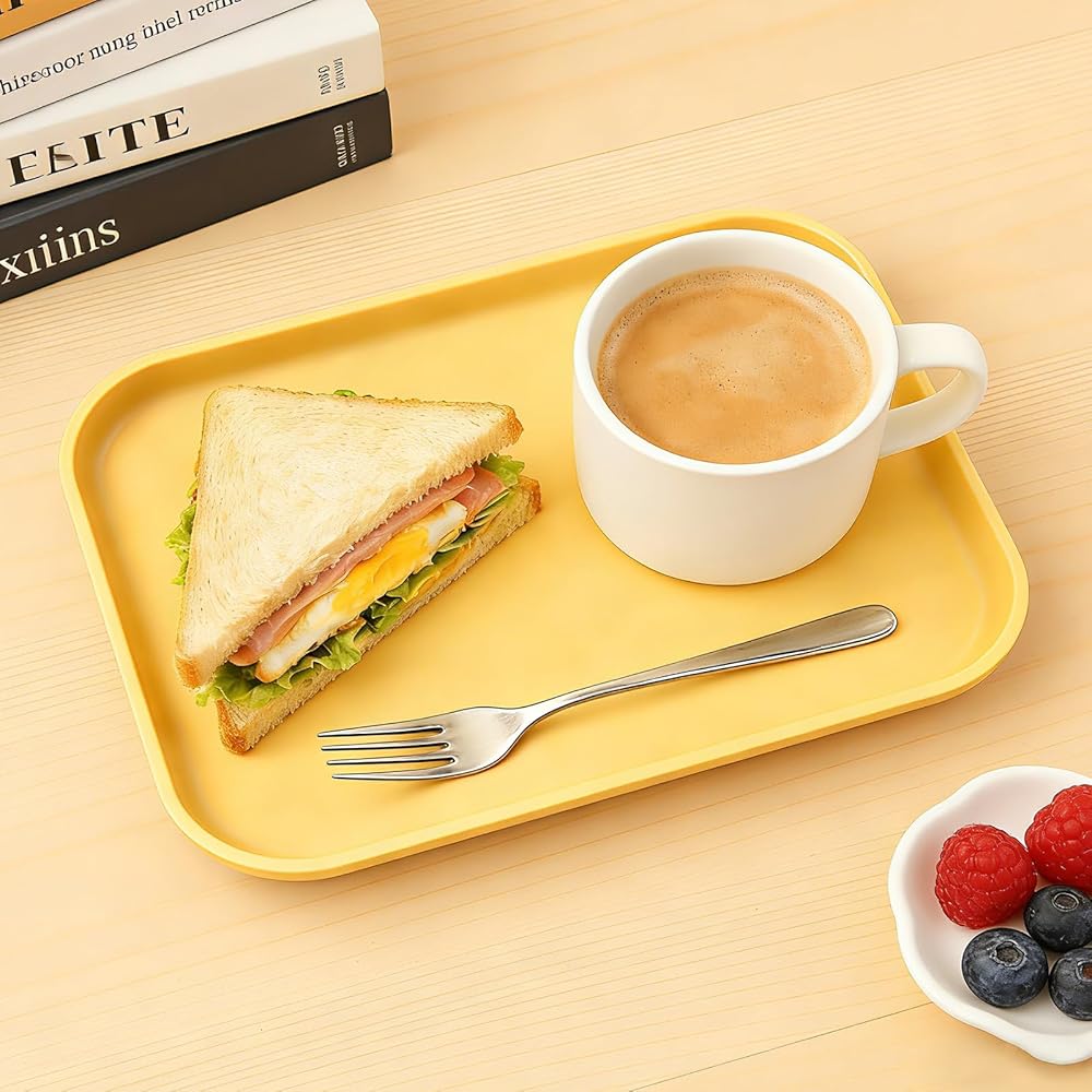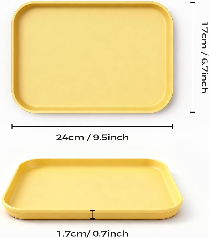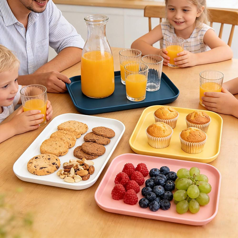 Elevate your entertaining game with this versatile set of colorful plastic serving platters. The collection includes four rectangular trays in crisp white, sunny yellow, soft pink, and deep navy blue—perfect for creating an eye-catching display at your next gathering. These lightweight yet sturdy serving dishes are ideal for presenting a variety of foods including appetizers, charcuterie arrangements, chips, candy, fresh fruit, sushi, and more. The smooth surface and raised edges prevent spills while making it easy to transport food from kitchen to table. The clean, modern design complements any table setting or decor style, making these trays equally suitable for casual family meals or special occasions. Their durable plastic construction ensures they're practical for everyday use, easy to clean, and conveniently stackable for space-saving storage. Add a pop of color to your table while keeping your favorite snacks and treats beautifully organized and accessible.