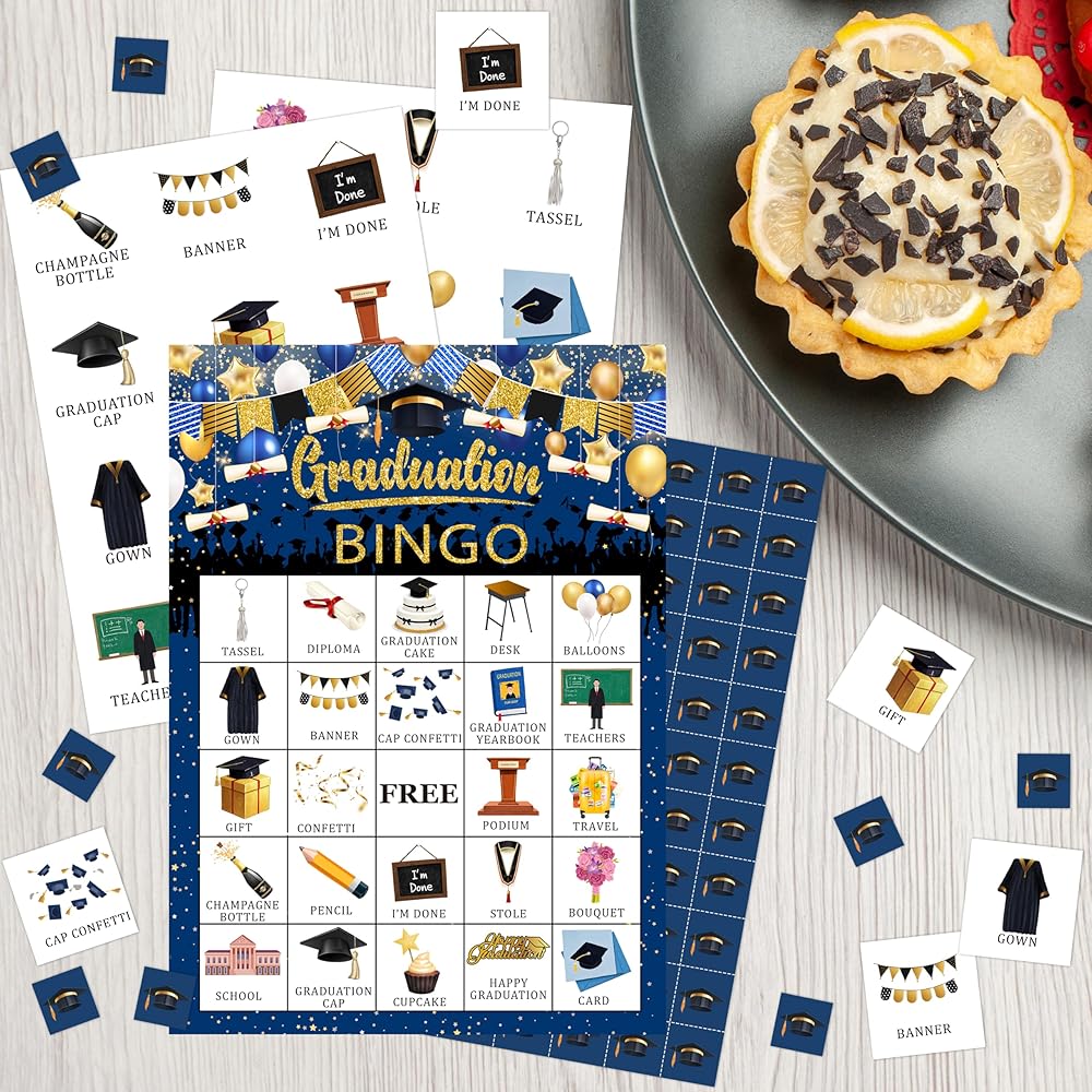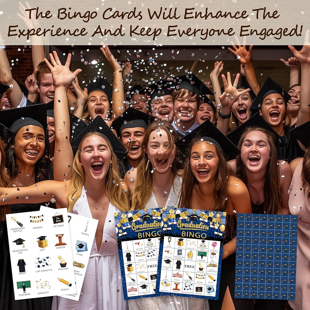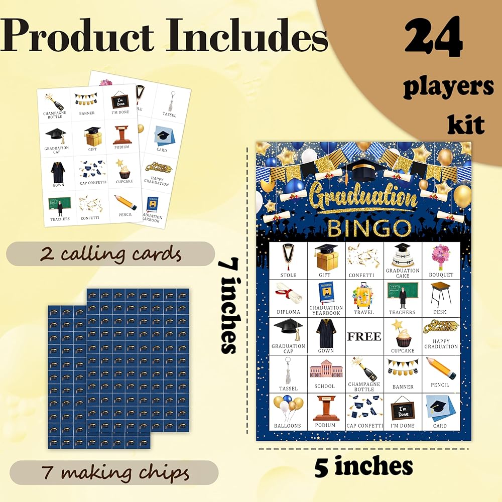 1. Bingo Set for Graduation Fun: Our graduation-themed Bingo set includes 24 player cards, 7 chips, and 2 calling cards, making it perfect for large graduation gatherings and group games. It's the ideal choice for graduation parties, reunions, and social celebrations.
