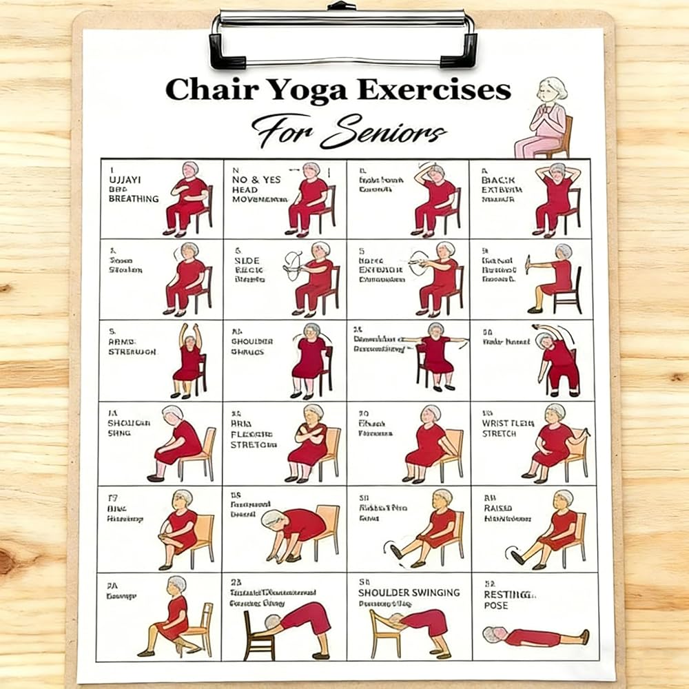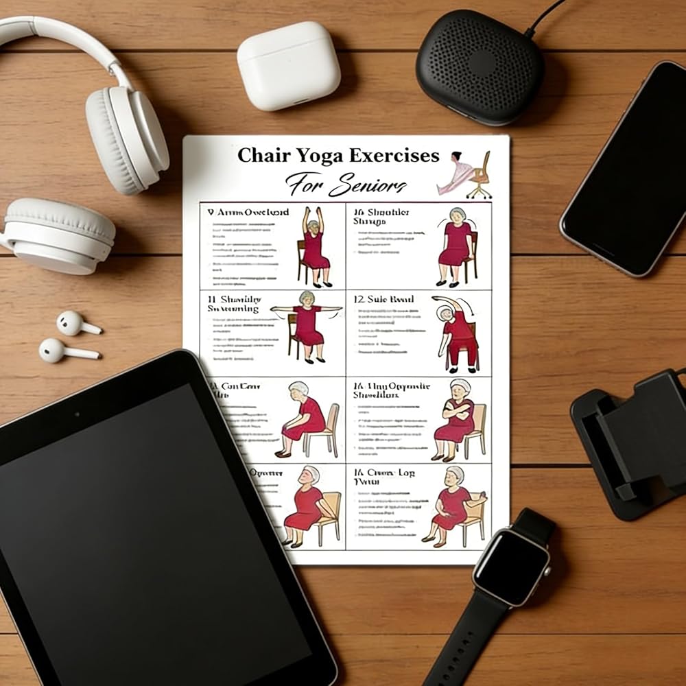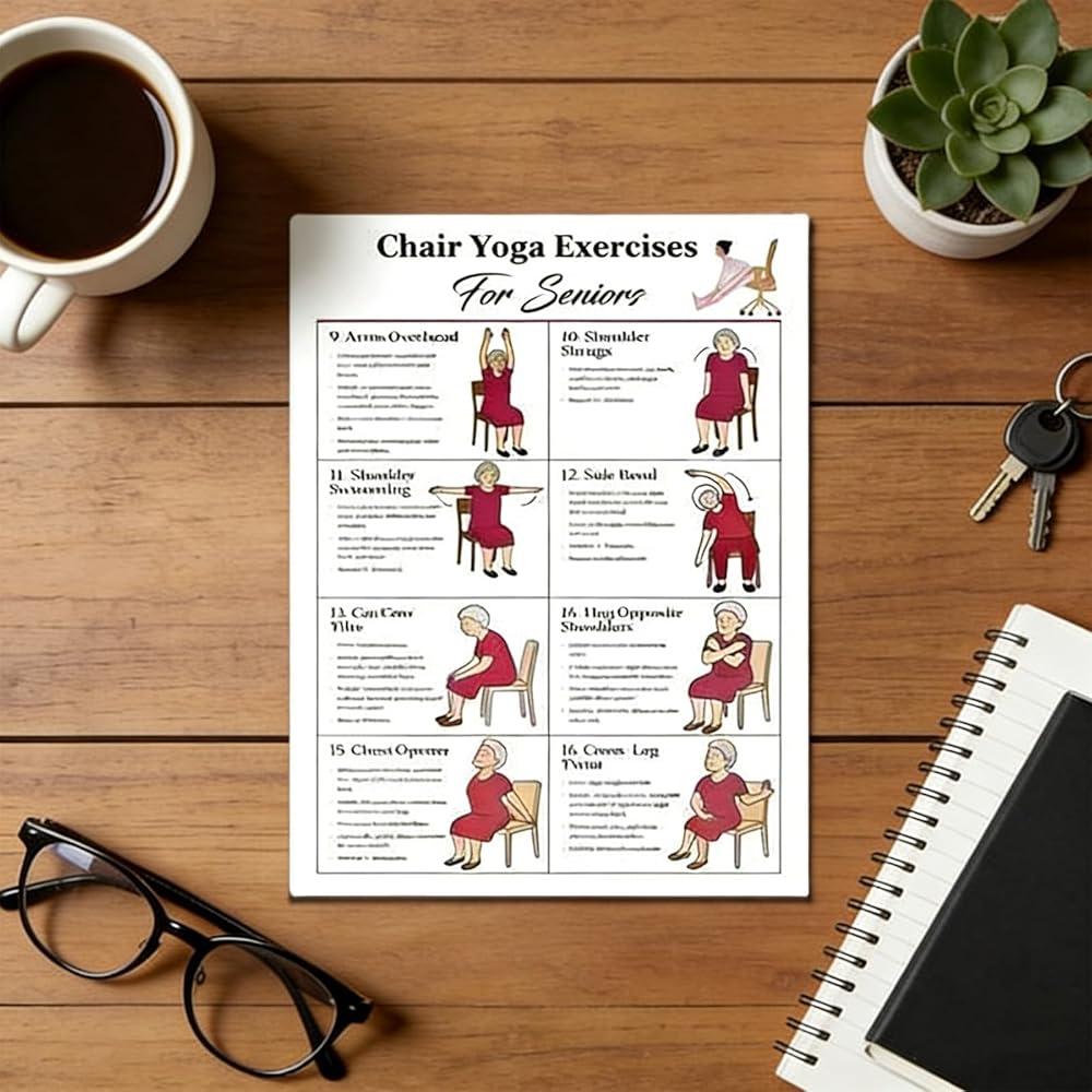 This set of chair yoga exercise charts can be easily posted on the wall or placed within view for simple follow‑along practice. An ideal tool to encourage at‑home fitness and daily activity.