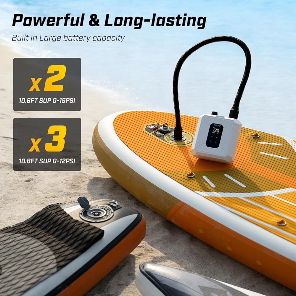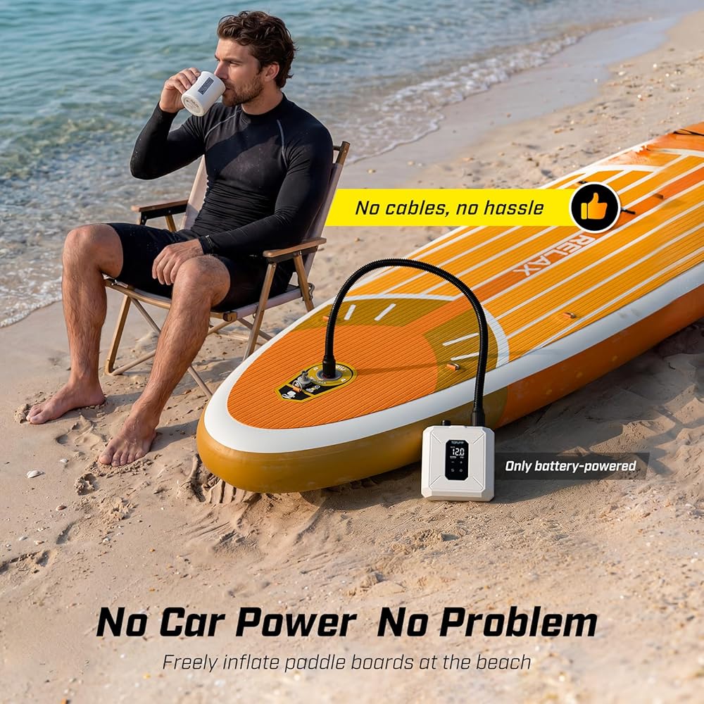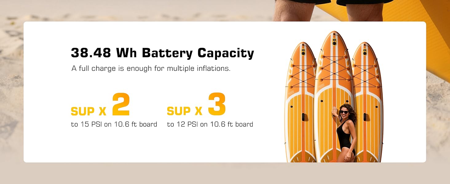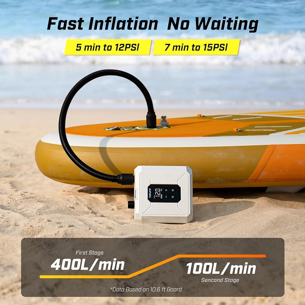 حرية لاسلكية: نفخ في أي مكان. لا يوجد منفذ سيارة ولا أسلاك تمديد - توفر مضخة لوح التجديف هذه طاقة قابلة لإعادة الشحن لثلاث وحدات SUP مقاس 10.6 بوصة (0-12 رطل لكل بوصة مربعة) لكل شحنة. تمكنك من النفخ السريع والخالي من المتاعب في أي مكان، والحصول على الماء بشكل أسرع.