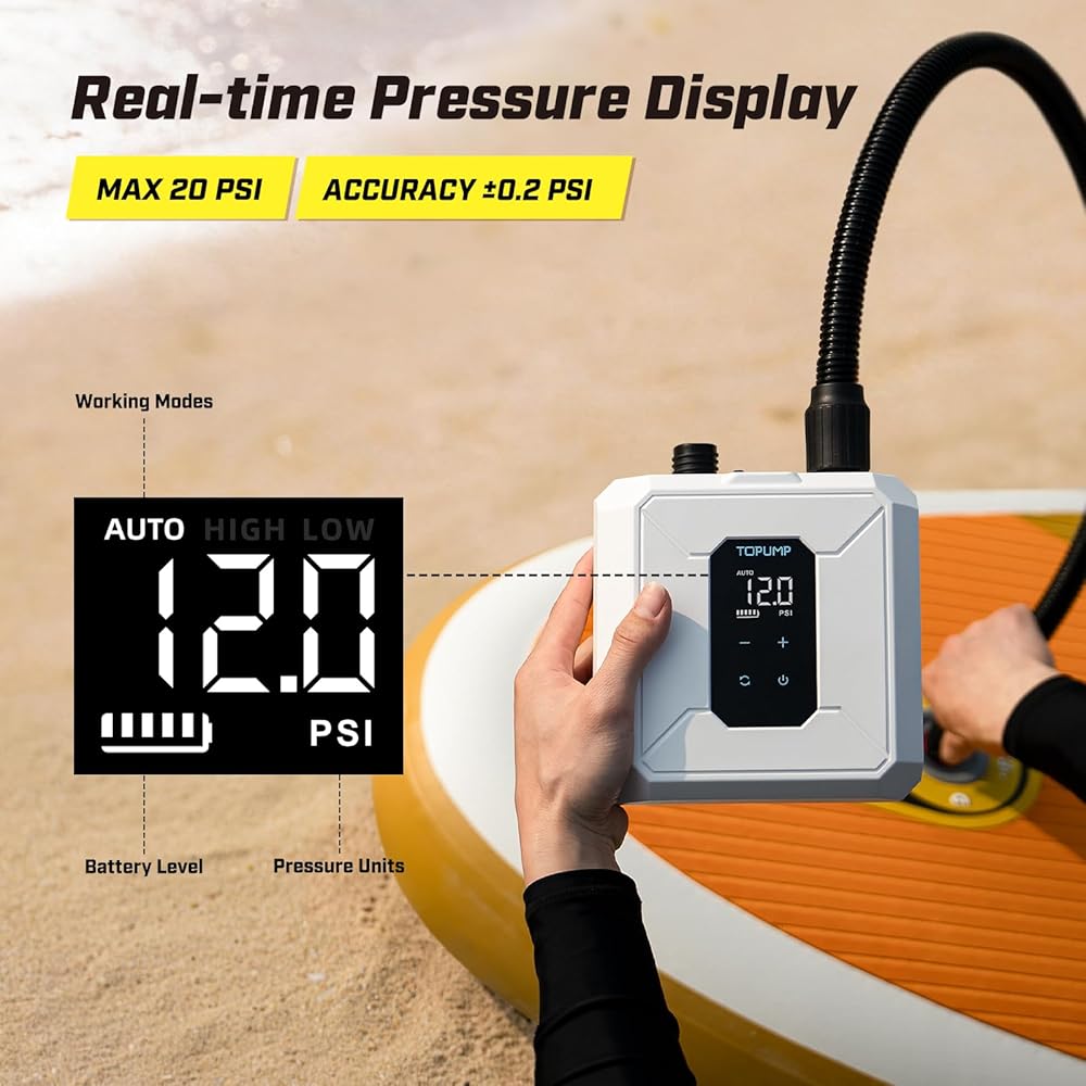 إيقاف تلقائي عند الهدف PSI. يتم نفخ مضخة الهواء SUP القابلة لإعادة الشحن هذه إلى الضغط المحدد مسبقًا (بحد أقصى 20 رطل لكل بوصة مربعة)، ثم تتوقف تلقائيًا - بدون نفخ زائد. اضغط لفترة طويلة على [مفتاح الوحدة] للتبديل بين الوضع المنخفض والعالي ووضع AUT. بدون استخدام اليدين أثناء إعداد معداتك.
