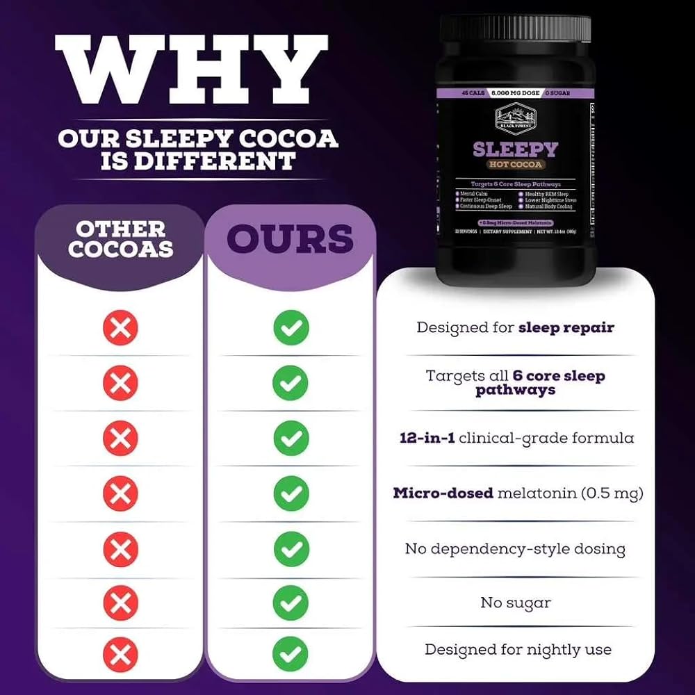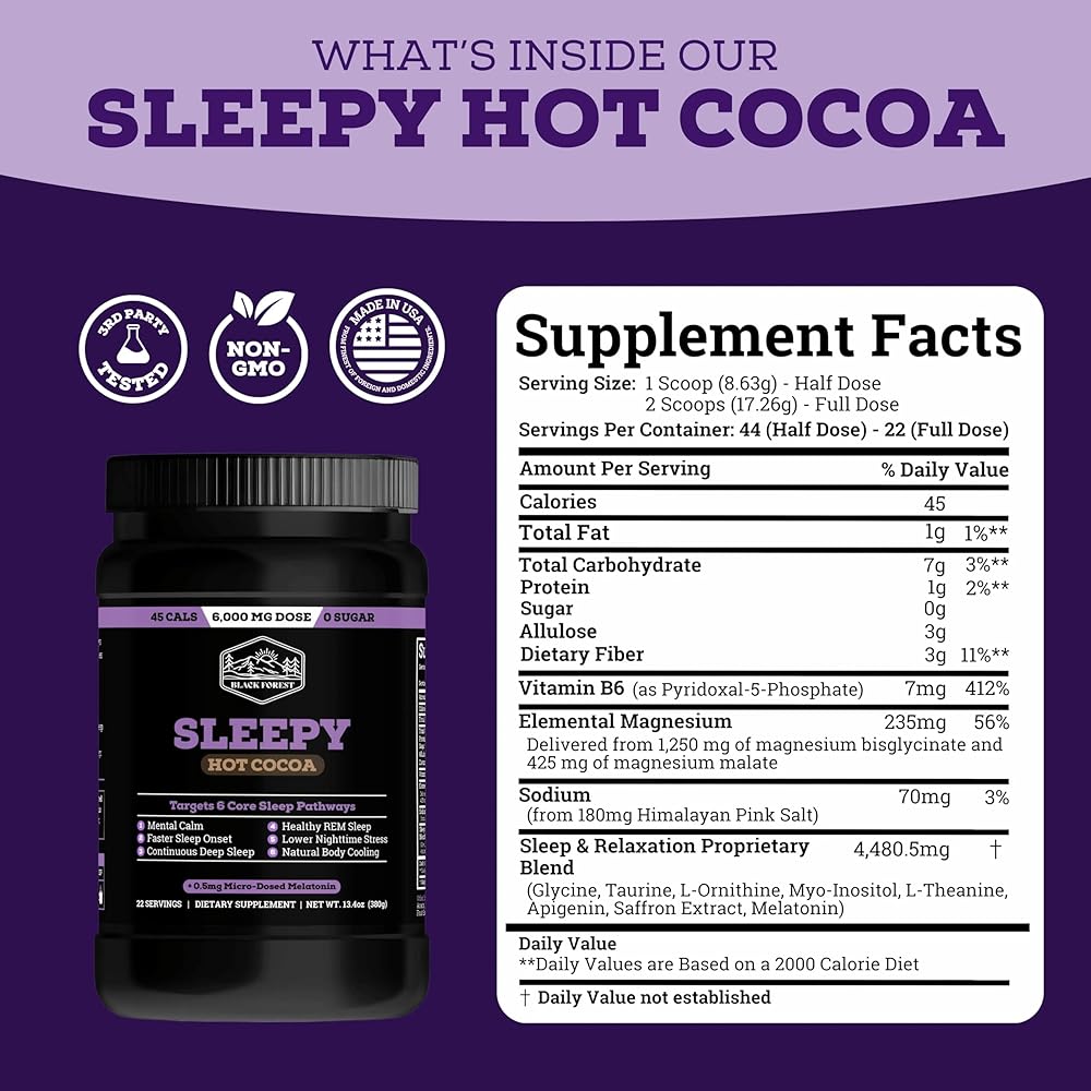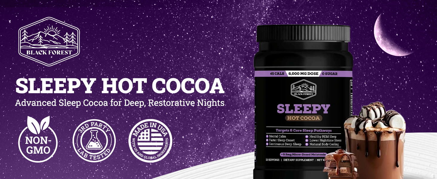 النوم طوال الليل - تستهدف الشوكولاتة الساخنة المغنيسيوم البقاء نائمًا بينما يهدئ إل-ثيانين الأفكار المتسارعة. يحتوي كاكاو النوم هذا على جرعات صغيرة من الميلاتونين (0.5 ملغ) والتي تعكس الإطلاق الطبيعي أثناء الليل دون الشعور بالترنح في الصباح.