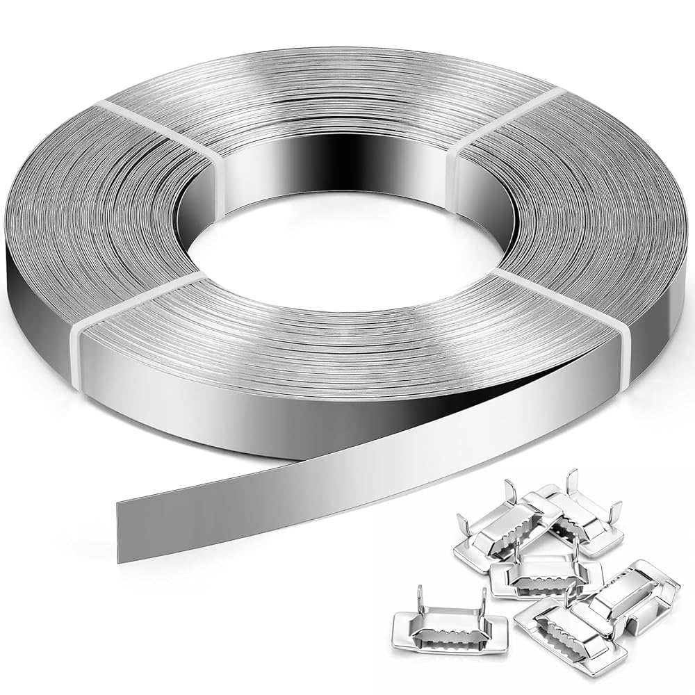 Complete Set for Bundling Tasks: the stainless steel banding strapping kit includes 1 coil of banding and 50 buckles; Ear Lokt buckles are included to hold the ends of the strapping; These buckles are made of stainless steel; When pressed, they form a closed lock; This function helps stop the strapping from moving; The buckles aid in keeping a bundle intact