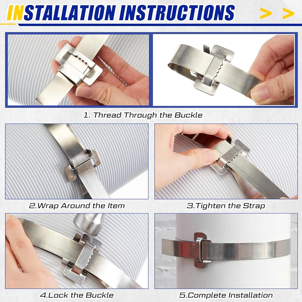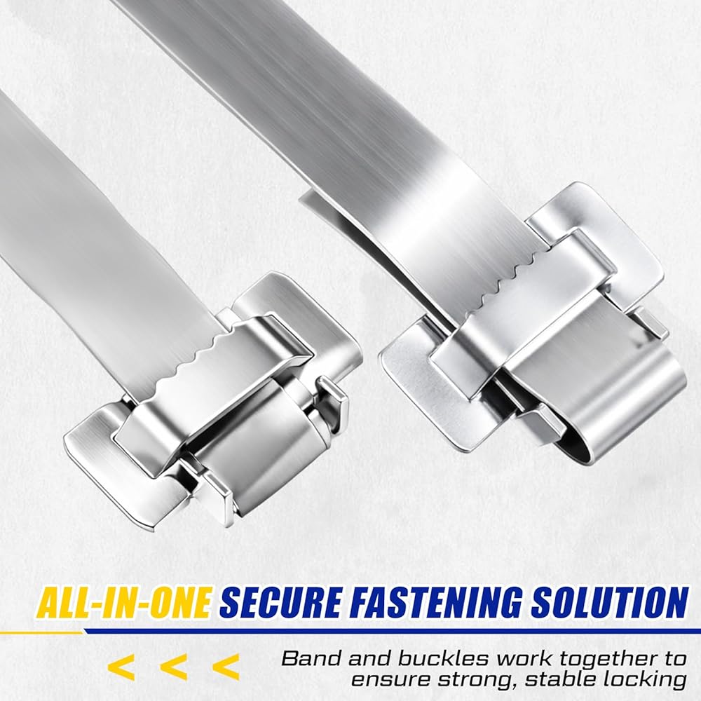 Upgraded Structure for Secure Fastening: the stainless steel strapping band has a design with a thicker profile; Its structure uses an ear buckle for locking; This combination keeps the fastening secure after tightening; The method for installation is clear; It is suited for various industrial and outdoor applications