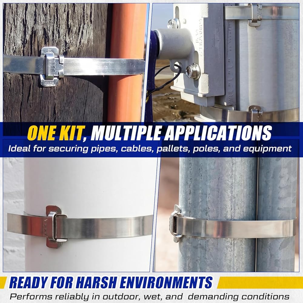 Material Resists Rust and Corrosion: the stainless steel banding strapping kit is made from 304 stainless steel; This material resists rust and corrosion; The kit performs in wet or outdoor conditions; Its construction allows for extended use over time; It is made for demanding settings