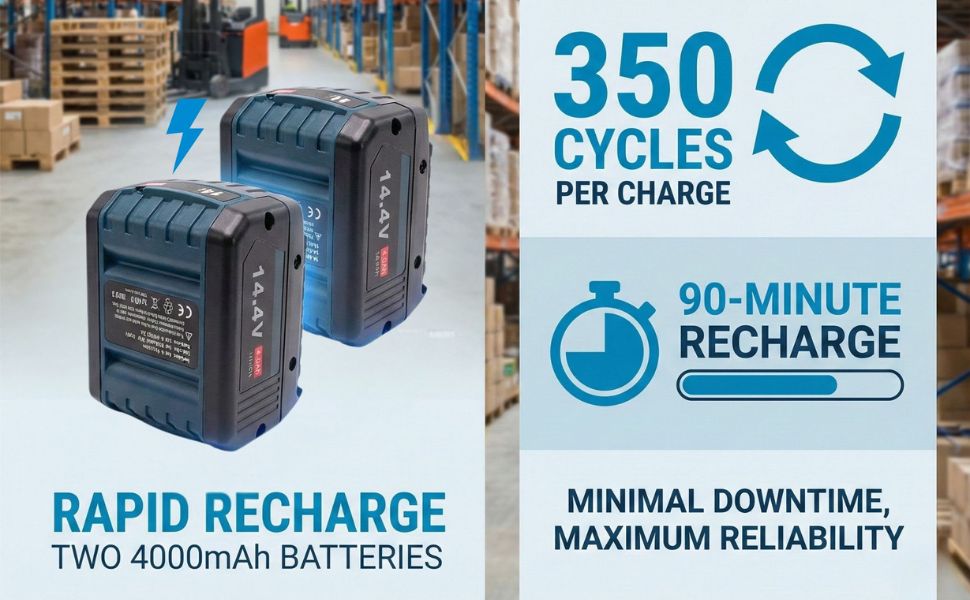 【طاقة بطارية طويلة الأمد】 - تأتي مع بطاريتين ليثيوم بقدرة 4000 مللي أمبير في الساعة توفر ما يصل إلى 350 دورة ربط لكل شحنة لكل بطارية. يعمل الشحن السريع لمدة 90 دقيقة والتصميم القابل للتبديل على إبقاء الأداة قيد التشغيل مع وقت توقف أقل.