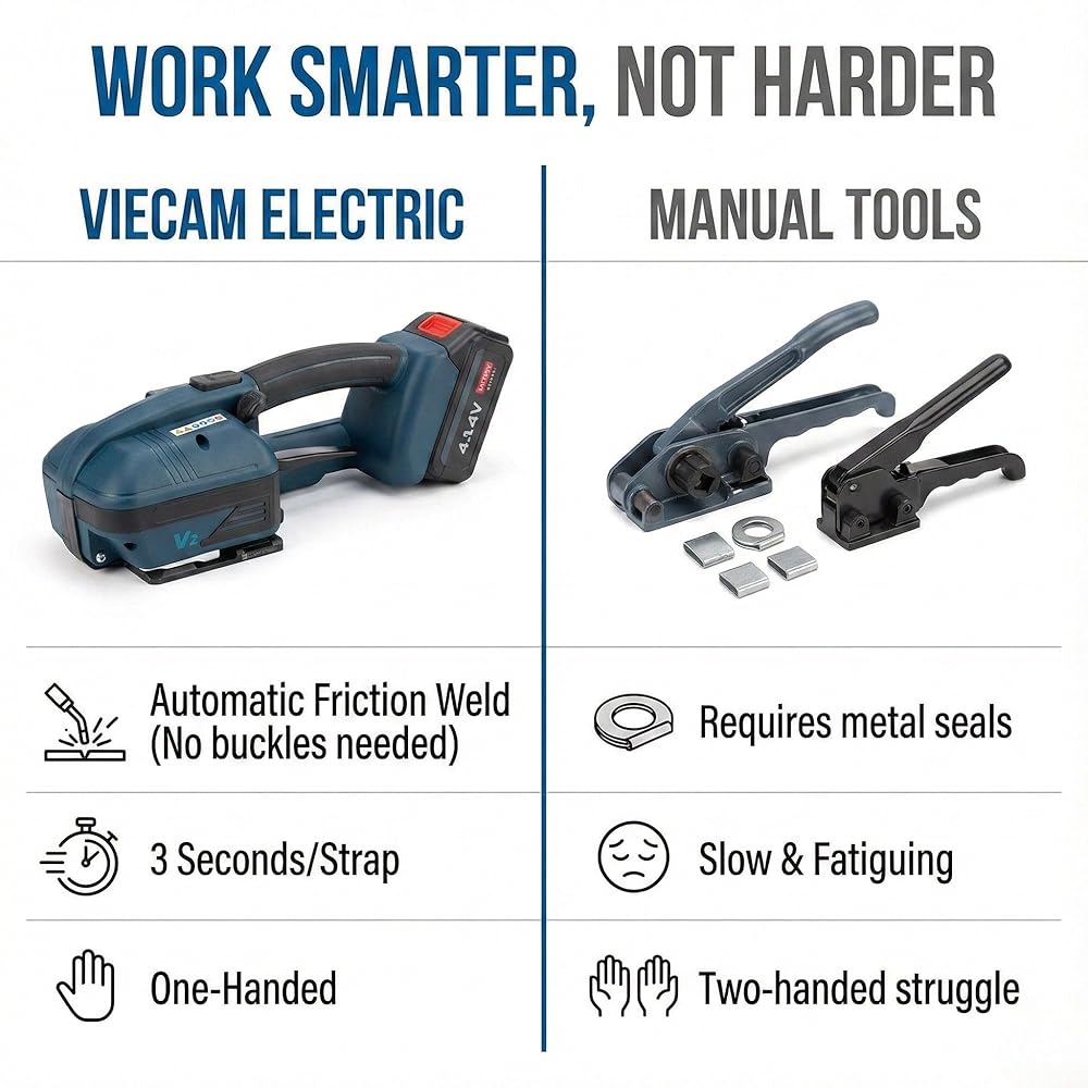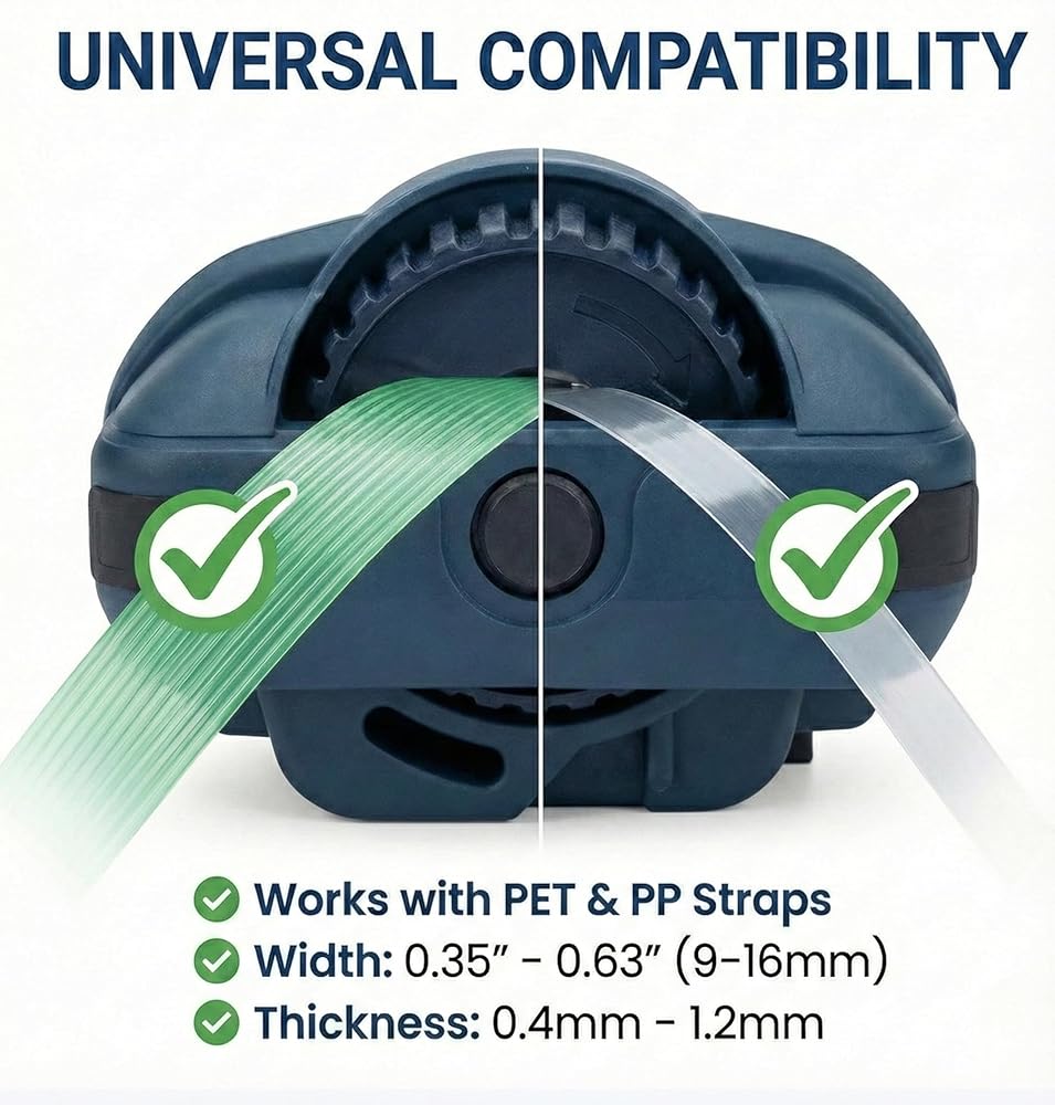 【تعمل مع أشرطة PET وPP】 - تتعامل مع أشرطة البوليستر (PET) والبولي بروبيلين (PP) بعرض يتراوح من 0.35 بوصة إلى 0.63 بوصة وسمك 0.4-1.2 مم، مما يوفر المرونة لتأمين الأحمال ذات الأحجام والأوزان المختلفة.