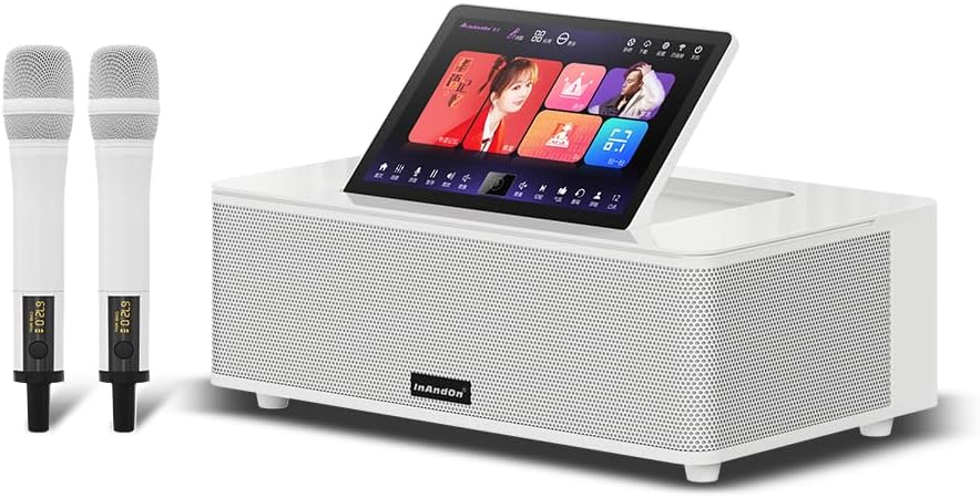 2026 KaraoPro KV-MS9 نظام مكبرات الصوت الكامل مع 2 ميكروفونات لاسلكية، مشغل كاريوكي صيني، شاشة لمس عالية الدقة 14 بوصة، تنزيل أغنية سحابية عالية السرعة 650K ويوتيوب (أبيض)