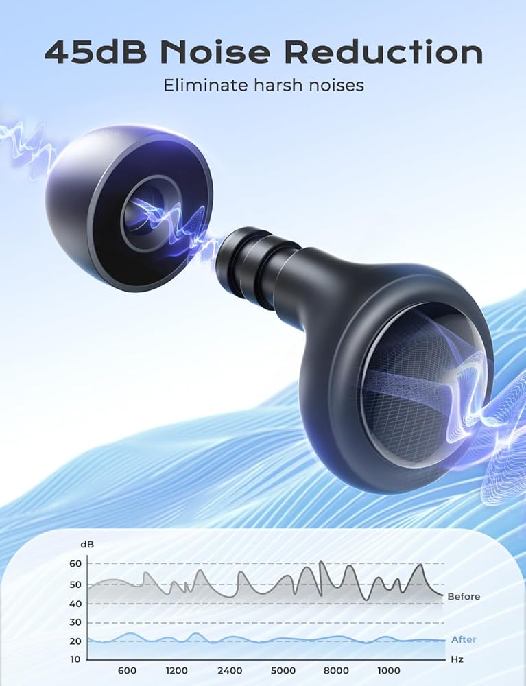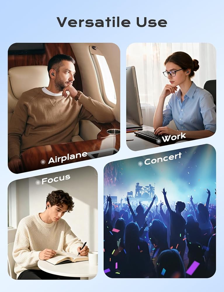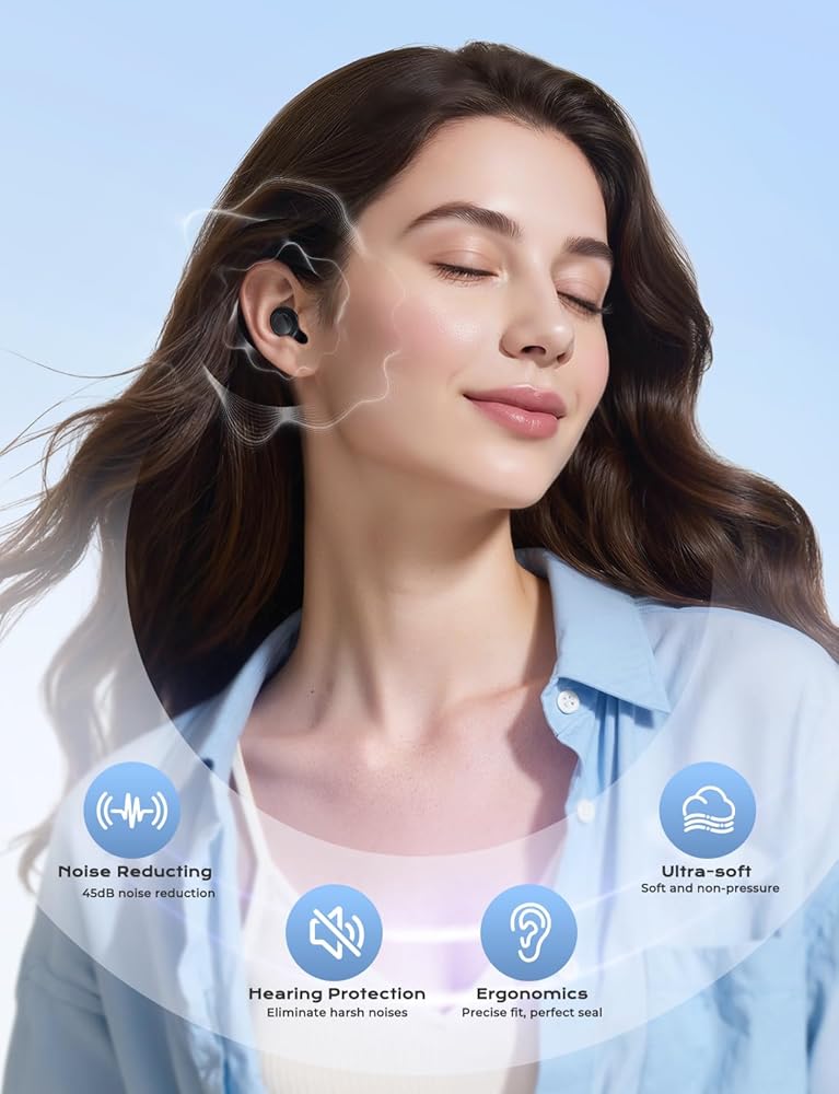 استخدام متعدد الاستخدامات: تم تصميم سدادات الأذن هذه لتحقيق أقصى قدر من التنوع، وتتميز بتقليل الضوضاء بقوة 45 ديسيبل لمنع حركة المرور، وضجيج الطائرات، والدردشة المكتبية، والآلات العالية، مما يجعلها مثالية للحفلات الموسيقية، والتنقل، والدراسة، وبيئات العمل عالية الضوضاء