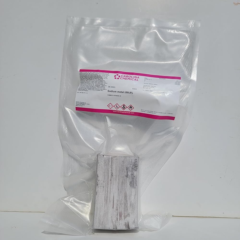 Sodium Metal, lightly oiled pieces, ≥99.8%, 500 grams from Carolina Chemical. Price includes the hazardous materials fee. CAS Number: 7440-23-5, Molecular Formula: Na. Molecular Weight: 22.99.