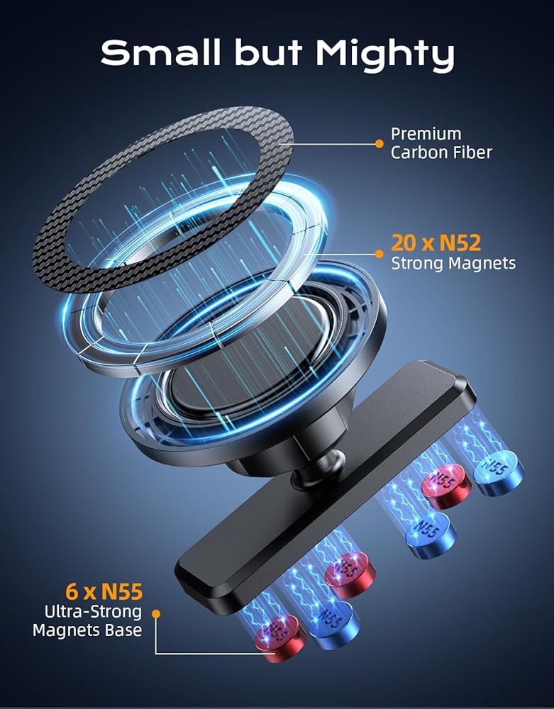 [تصميم مغناطيسي قوي للغاية على الوجهين] يتميز بستة مغناطيسات N55 فائقة القوة على القاعدة وعشرين مغناطيس N52 في تصميم مزدوج الحلقة على جانب الهاتف، يوفر حامل هاتف عربة الجولف هذا قوة تحمل استثنائية. يبقى جهازك ثابتًا في مكانه بشكل آمن على أي سطح معدني، حتى أثناء ركوب عربة الجولف الوعرة. لا يوجد انزلاقات أو تذبذبات، فقط الموثوقية الكاملة.