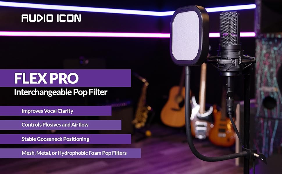 صوت نظيف واحترافي: احصل على أصوات سلسة ومتوازنة عن طريق تقليل الانفجارات القاسية وانفجارات الهواء. يوفر جهاز Flex Pro تسجيلات واضحة بجودة الاستوديو للفنانين ومقدمي البث الصوتي ومحترفي التعليق الصوتي.
