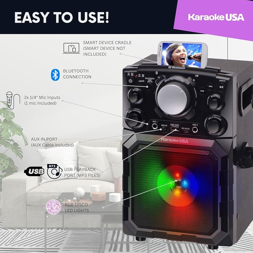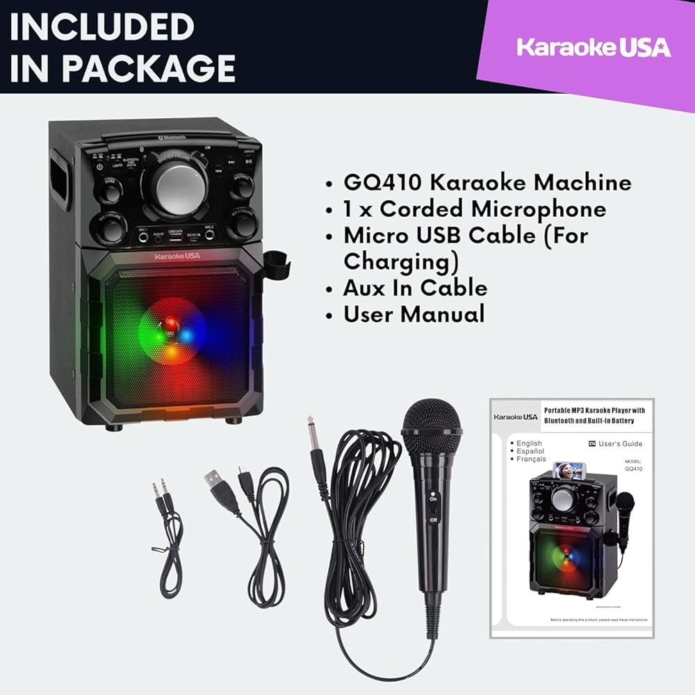 The Karaoke USA OGQ410 Portable MP3 Karaoke Machine combines power, portability, and fun in one sleek design. Stream music via Bluetooth, play MP3s from a USB, or connect through Aux-In for instant entertainment. With dual mic inputs, a built-in LED speaker, and a rechargeable battery offering up to two hours of playtime, this all-in-one karaoke system is perfect for home parties, classrooms, or outdoor events. Lightweight and easy to use, it also doubles as a PA system for announcements or events.
